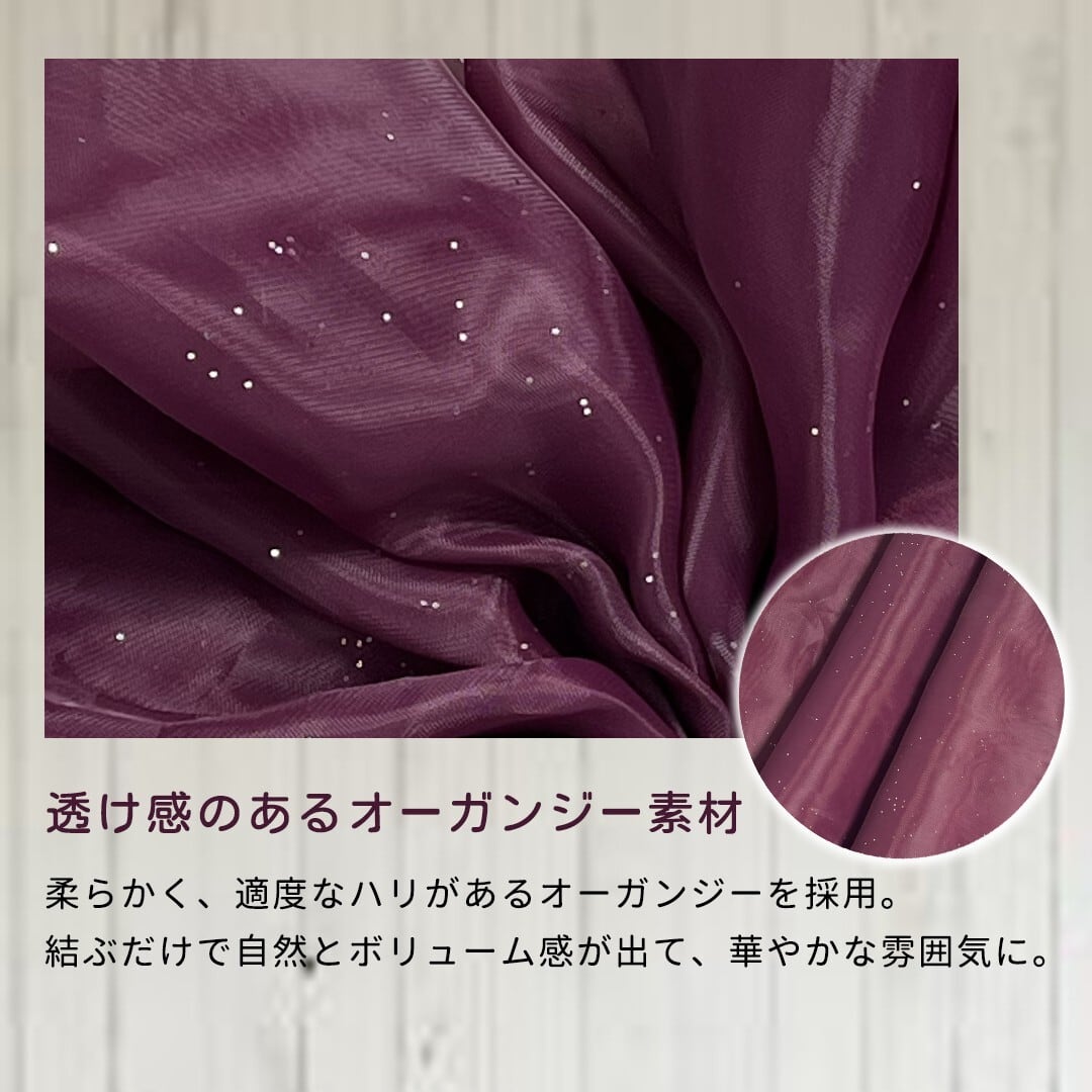 ●夏祭り&花火大会:浴衣にふんわりと結んで、ガーリーで可愛いスタイルに。 ●成人式&卒業式:袴や振袖にボリュームを出して、華やかな仕上がりに。 ●七五三&お祝い事:お子さまの着物スタイルにもぴったり。ふんわりしたアレンジが可愛らしい印象に。 ●カジュアルな和装にも:普段の着物や訪問着にも合わせやすく、おしゃれな和洋折衷コーデを楽しめます。