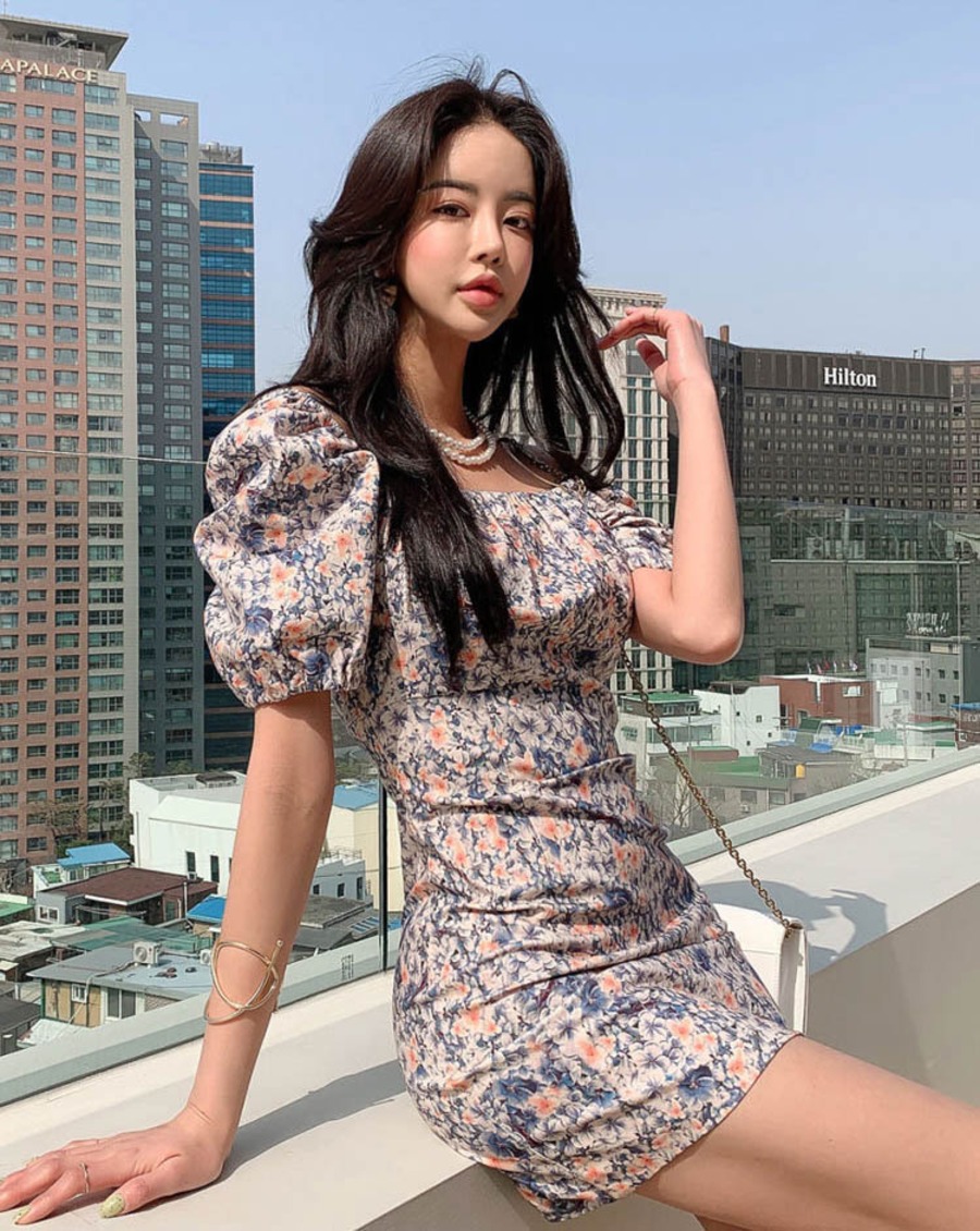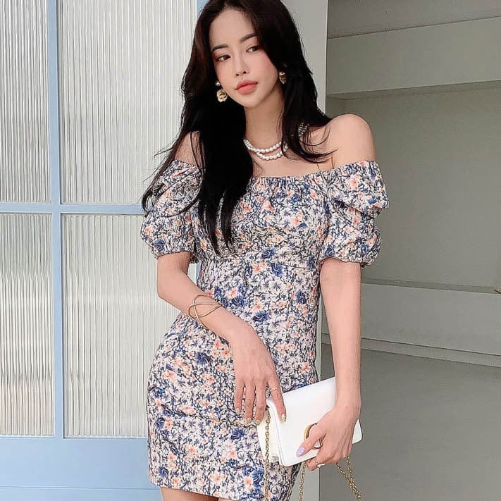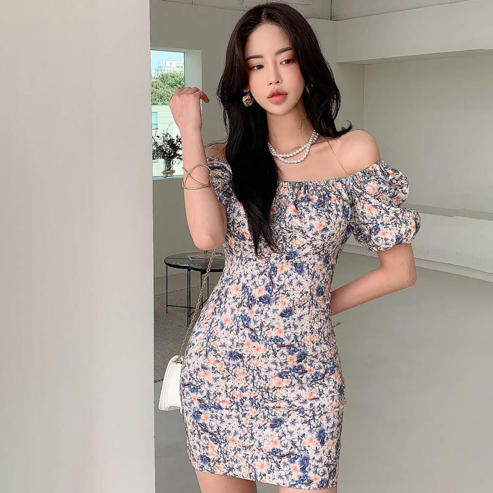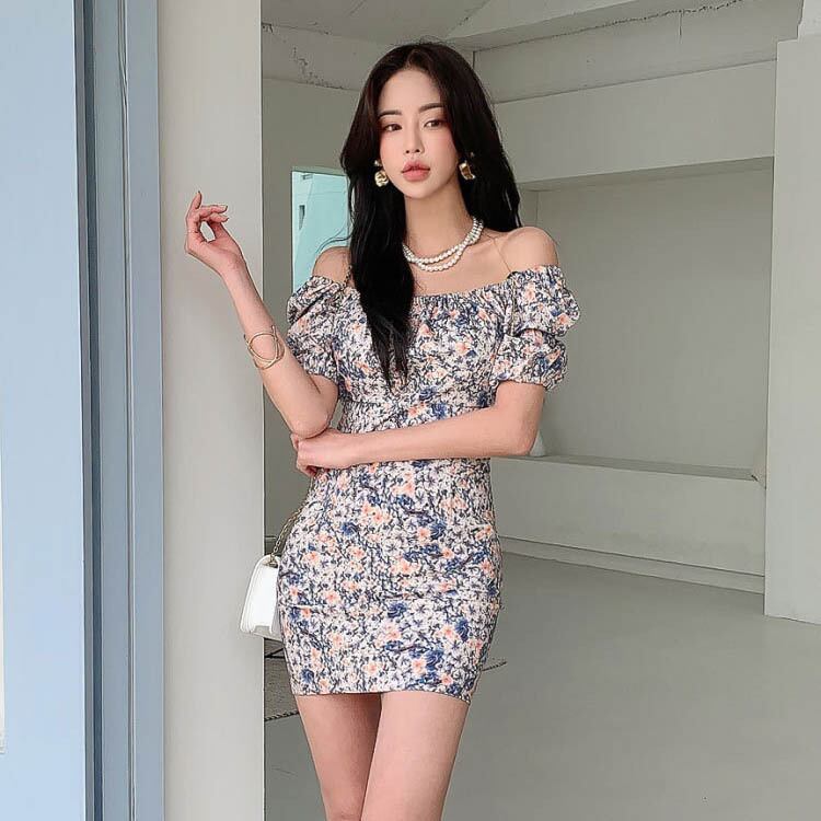 ミニドレス花柄パフスリーブオフショルダーエレガントカワセクシータイトドレスパーティーエレガント WQ2-ZED885751A71