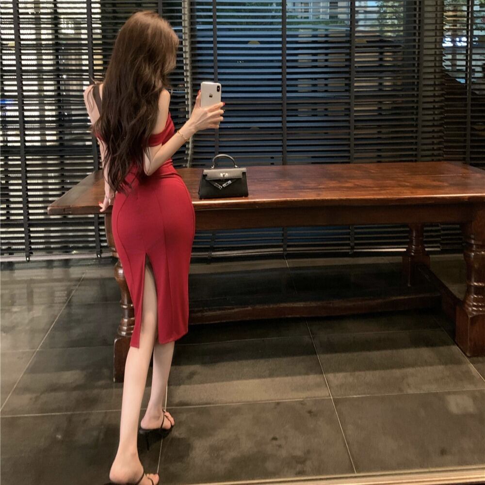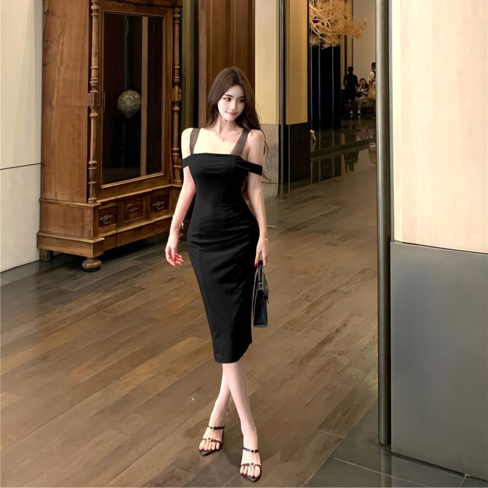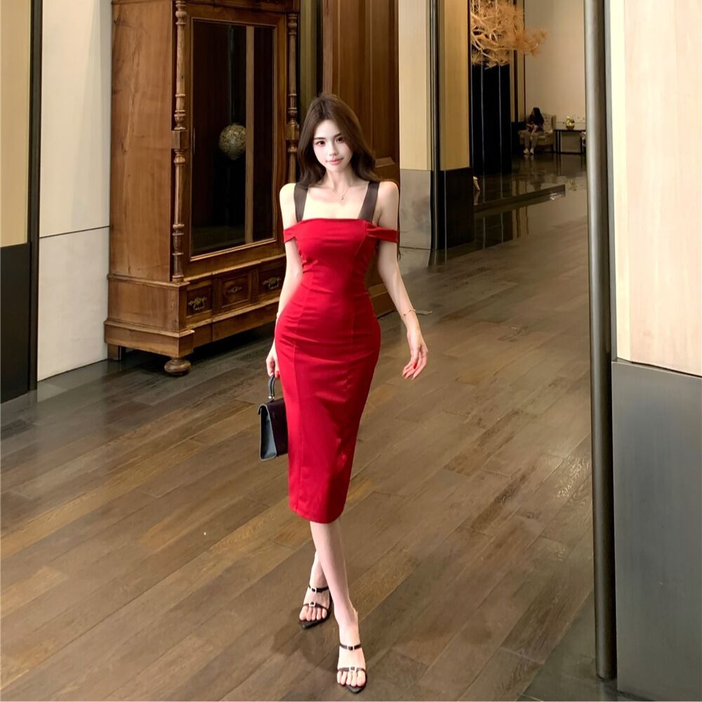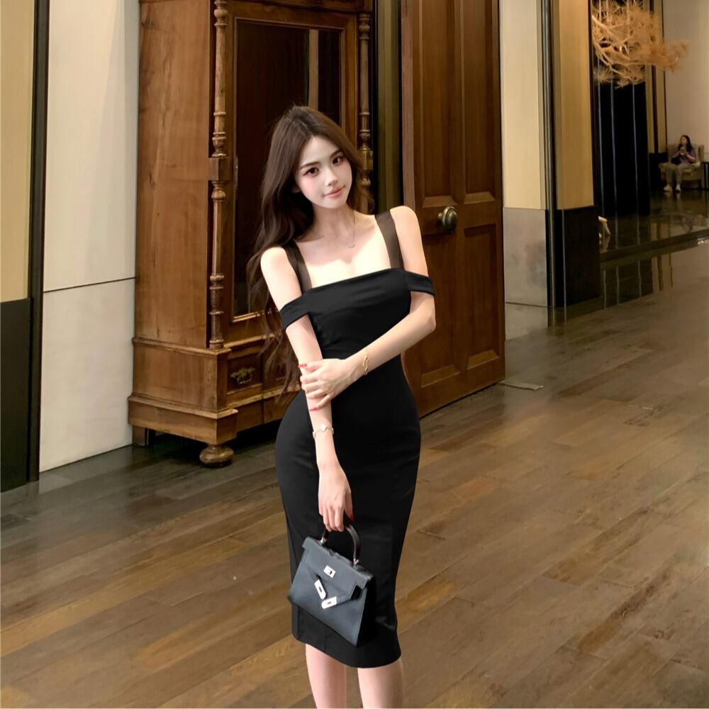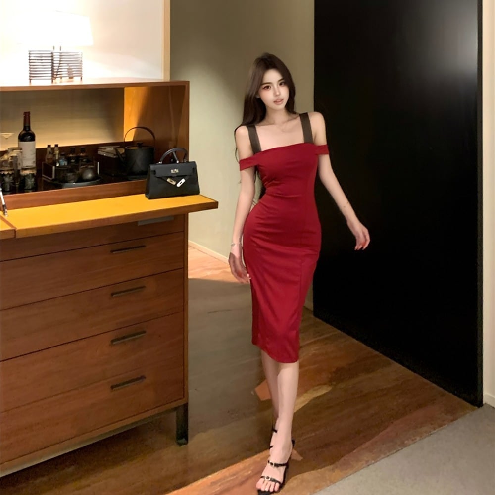 【2色】膝丈ドレス タイトドレス オフショルダー セクシー エレガント 気質 着痩せ XH2-DD4941