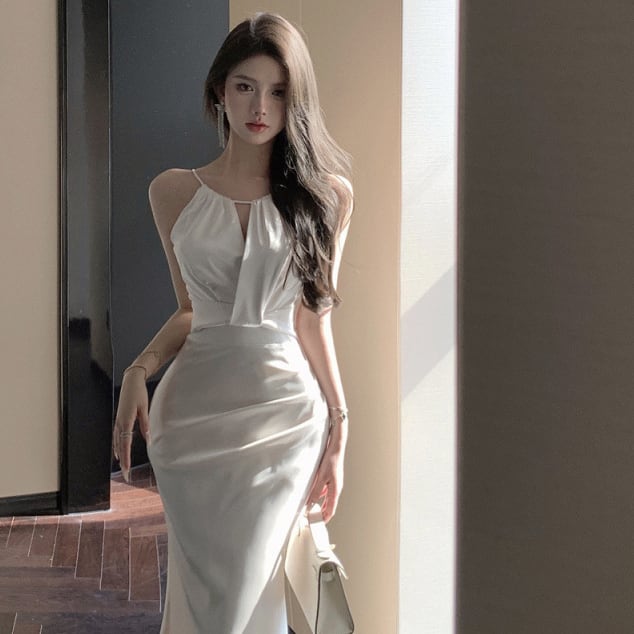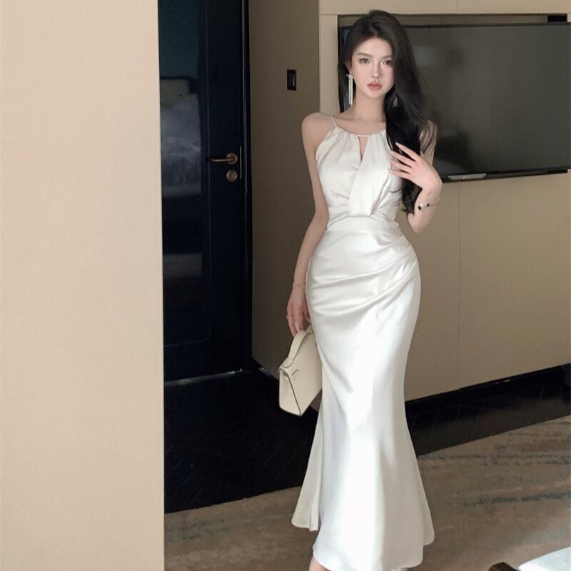 ロングドレス セクシー ホワイトサテン ホルターネック マーメイドロングドレス エレガント 結婚式のお呼ばれ パーティー JC2-XKDD200-0615A-Sep3