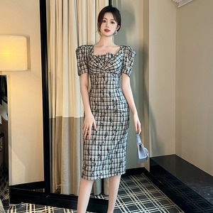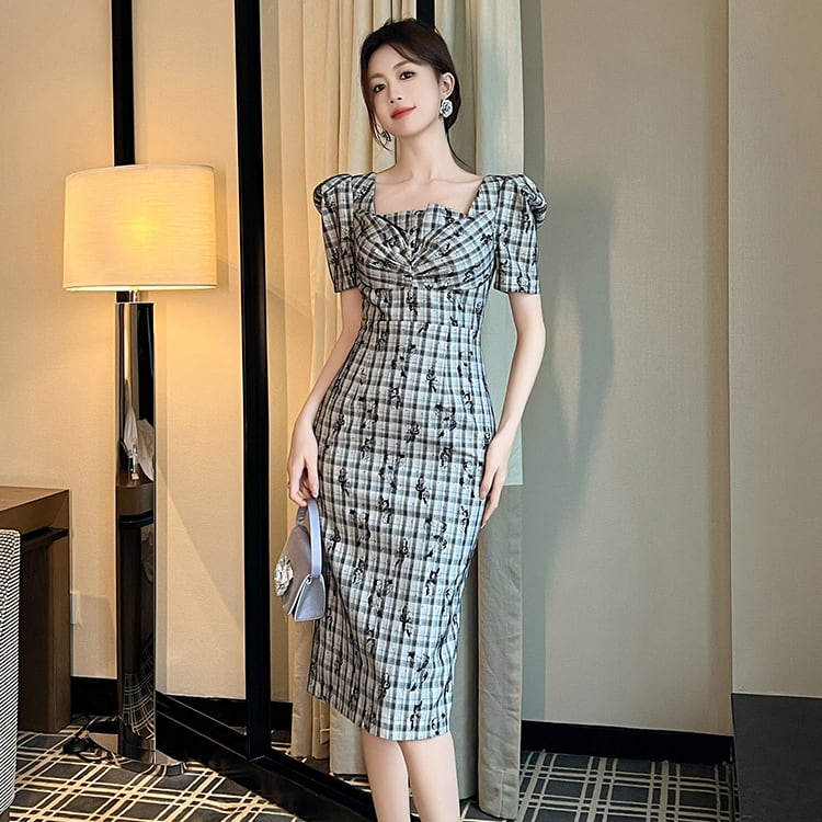 膝丈ドレス エレガント ハンドメイド フレンチレトロ チェック柄 スクエアネック パフスリーブ タイトワンピース 刺繍入り デート お出かけ パーティー JC2-JY21303