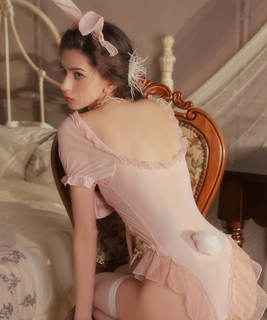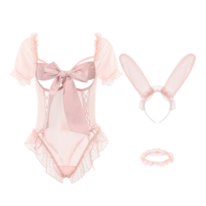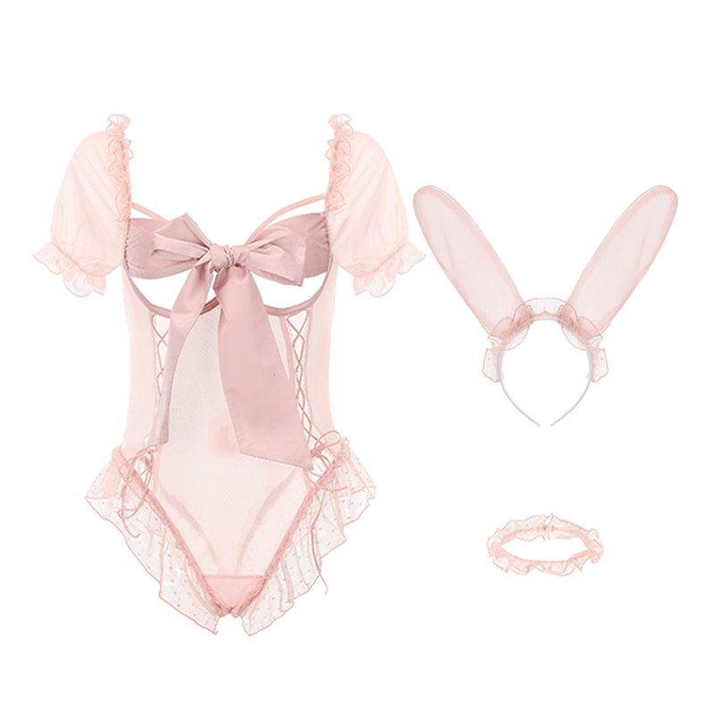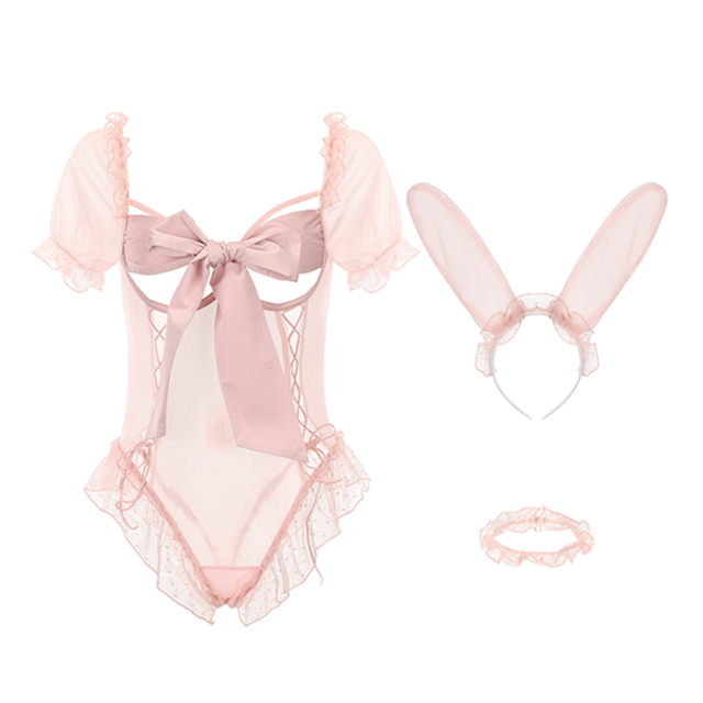ランジェリー セクシー 透け感レースボディスーツ スコスプレ ウサギ耳ボディスーツセット しっぽ付き KS2-GRG5258