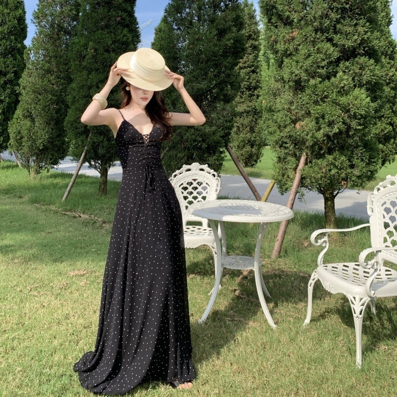 ロングドレス キャミワンピ フレンチレトロドット柄 Vネック エレガント 着痩せ デート 女子会 JC2-CD6-157-82430670