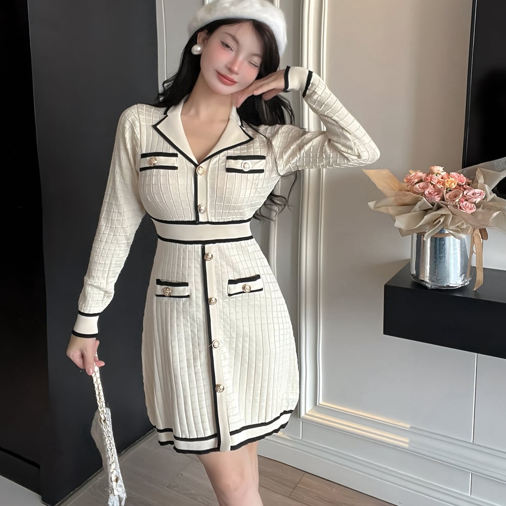 【2色】ミニドレス キャバドレス ツイード風 ニット 長袖 着痩せ バイカラー エレガント 小柄向け デート 女子会 JC2-DD5603