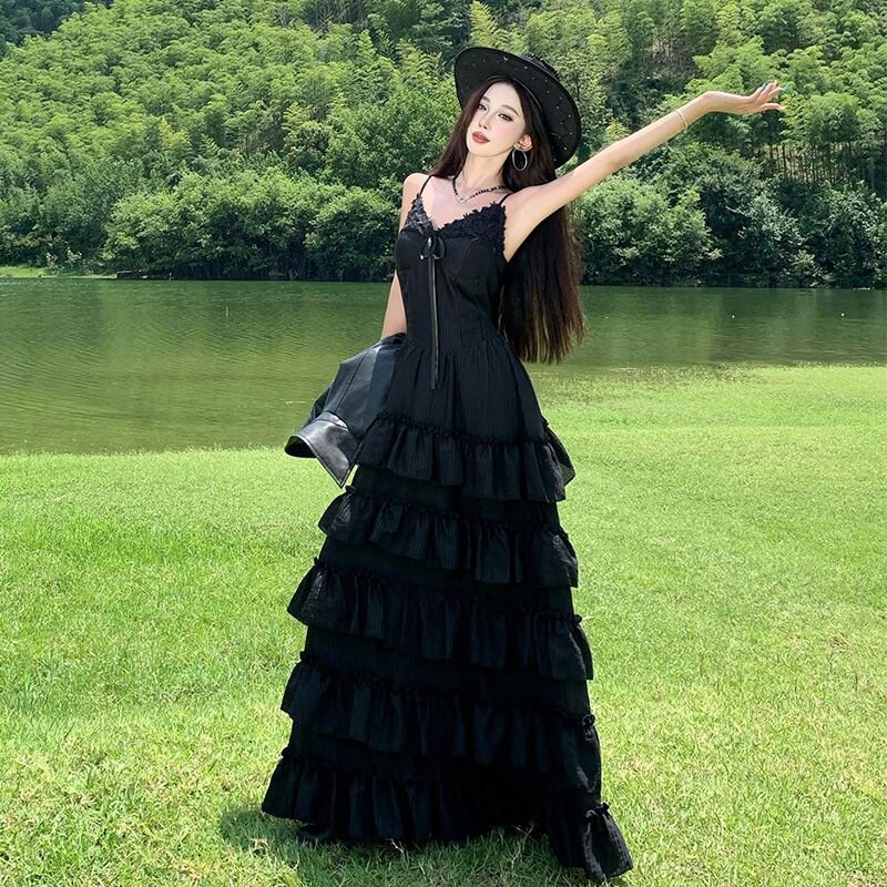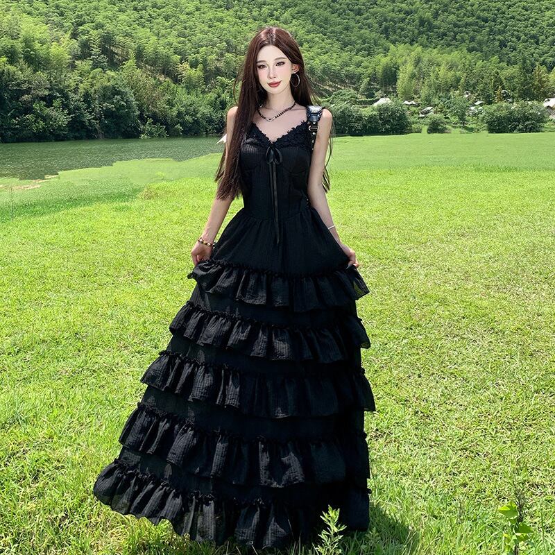 ロングドレス フレンチフェミニン エレガント レース切替 Vネック キャミワンピ ウエストシェイプ ティアードフレア 上品 大人可愛い デート お出かけ 結婚式 JC2-CD3-141-5510900
