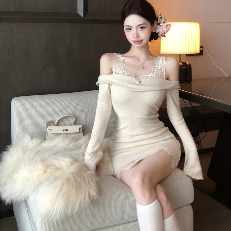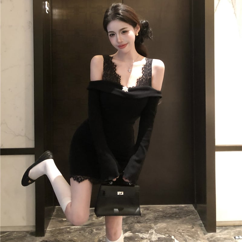 【2色】ミニドレス キャバドレス セクシー フレンチエレガント オフショルダー レース切替 ニット スリムフィット 秋冬 デート お出かけ JC2-XKDD426-7932-Sep21
