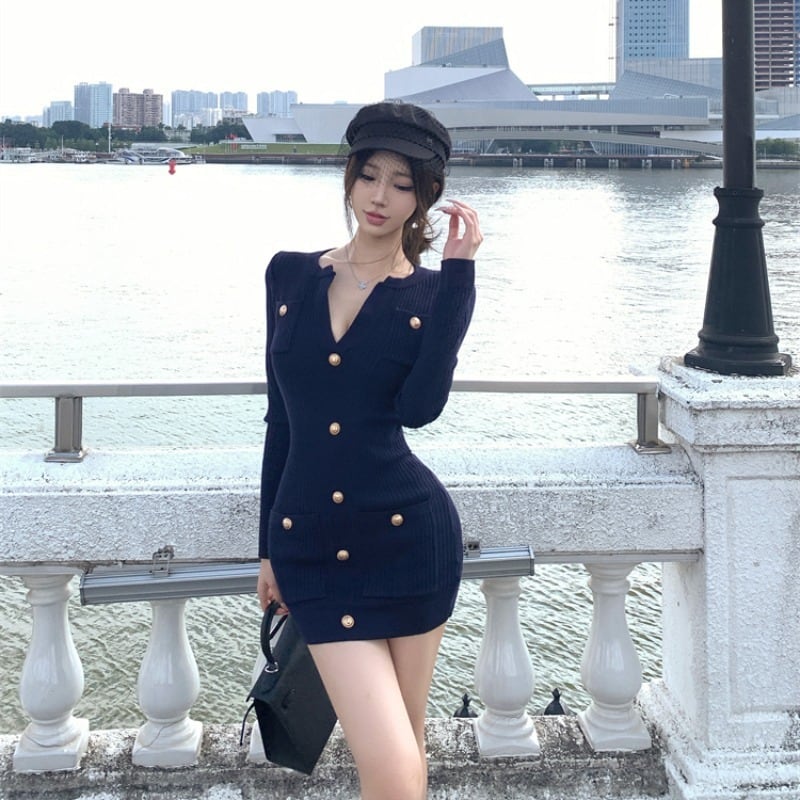 ミニドレス キャバドレス セクシー シャネル風 ニット ウエストシェイプ ボタンデザイン エレガント ラグジュアリー デート お出かけ JC2-XKDD355-6978-Sep21
