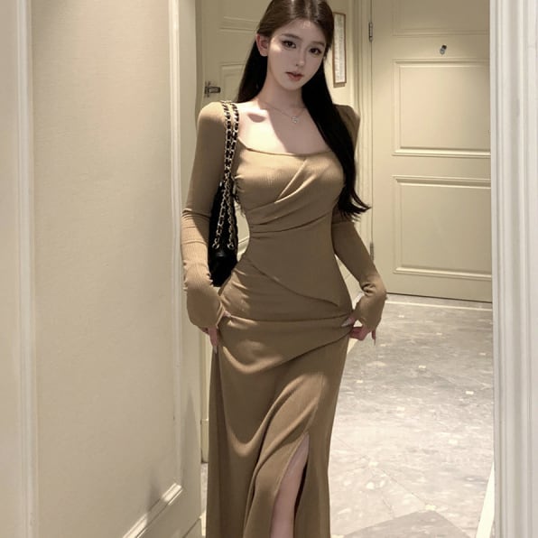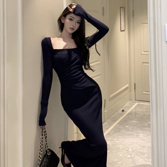 【2色】Lady's coco ロングドレス キャバドレス セクシー スクエアネック コットン ニット 長袖 スリット入り ウエストマーク お出かけ デート 出勤 JC2-XKDD337B-2176-Sep26