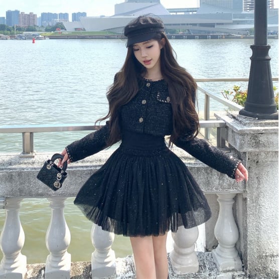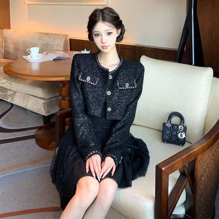 【2点セット】ミニドレス キャバドレス セクシー 高見え フレンチ風 セレブ系 スリム ショートアウター×ミニワンピ セットアップ スパンコールデザイン デート お出かけ JC2-XKDD335B-6502-Sep26