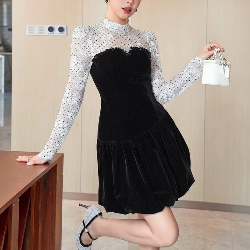 【秋冬新作】 ミニドレス キャバドレス セクシー フレンチフェミニンドットチュール切り替え ベロア素材 ウエストマーク 上品 着痩せ ドレス風 レディース フレンチフェ ドットチュール切り替え ウエストマーク 上品 着痩せレディース デート LW2-JY21889