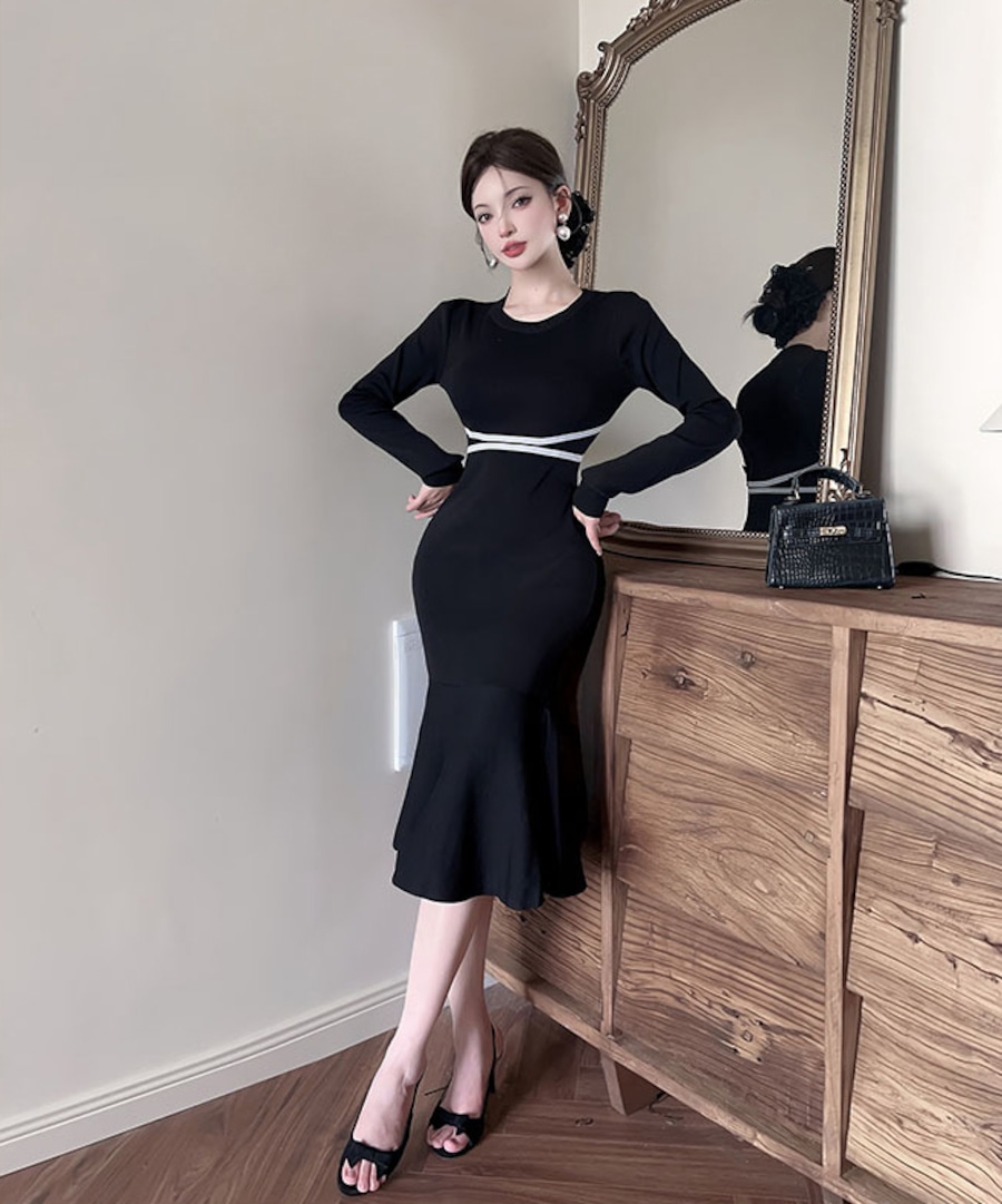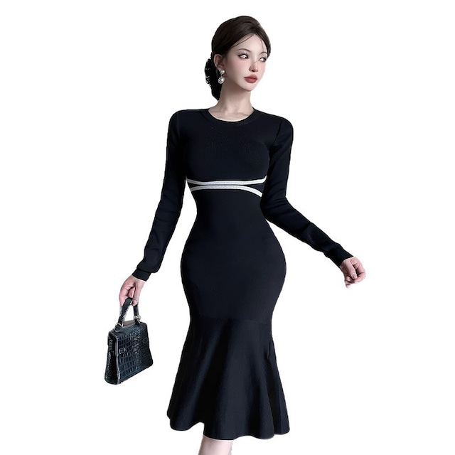 膝丈ドレス キャバドレス セクシー フェミニン ニットワンピース ラウンドネック ウエストマーク マーメイドライン 大人可愛い デート LW2-ZED885053GT510D