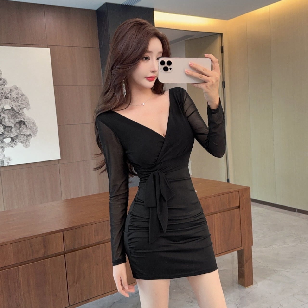 【3色】ミニドレス キャバドレス セクシー オフショルダー メッシュ タイトワンピース Vネック 長袖 伸縮性あり LW2-DD5832