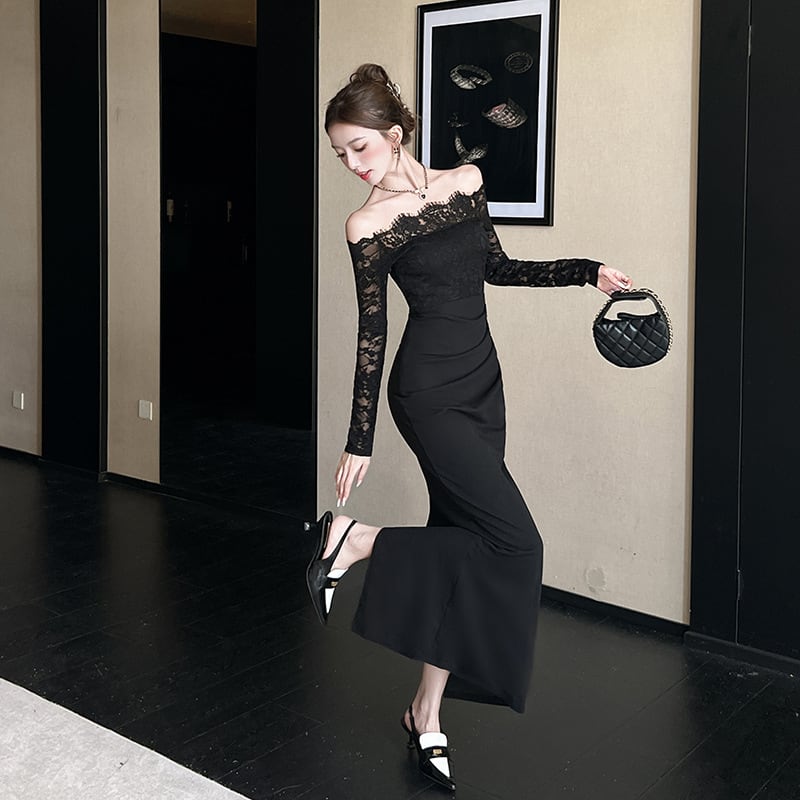 Lady's coco ロングドレス キャバドレス セクシー オフショルダー レース切り替え スリムフィット エレガントドレス 結婚式 二次会 披露宴 パーティー 上品 LW2-DD5922