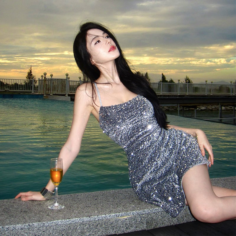 Lady's coco ミニドレス キャバドレス セクシー スパンコール キャミドレス バックリボン パーティー デート LW2-CD3-141-26120450