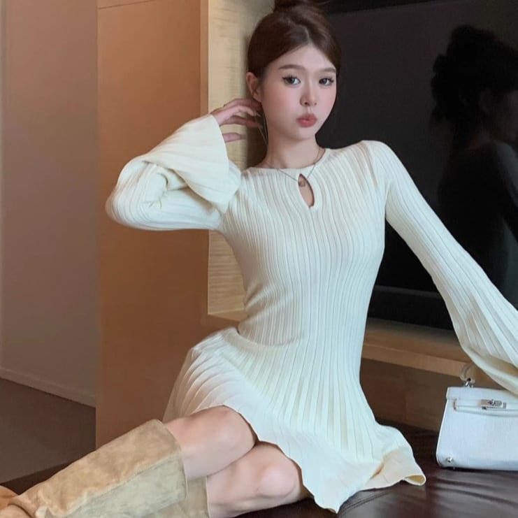 【2色】 ミニドレス キャバドレス セクシー ヘプバーン ニットワンピース トランペットスリーブ フレアスカート Aライン お出かけ デートLW2-OYF64044