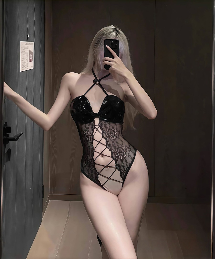 ベビードール ランジェリー セクシー オープンクロッチ レース×クロスストラップ ベル付き 光沢ボディスーツ ボディコン LW8-DMLF616