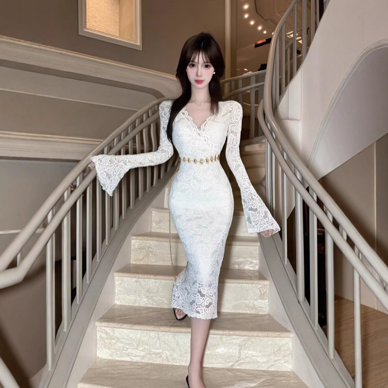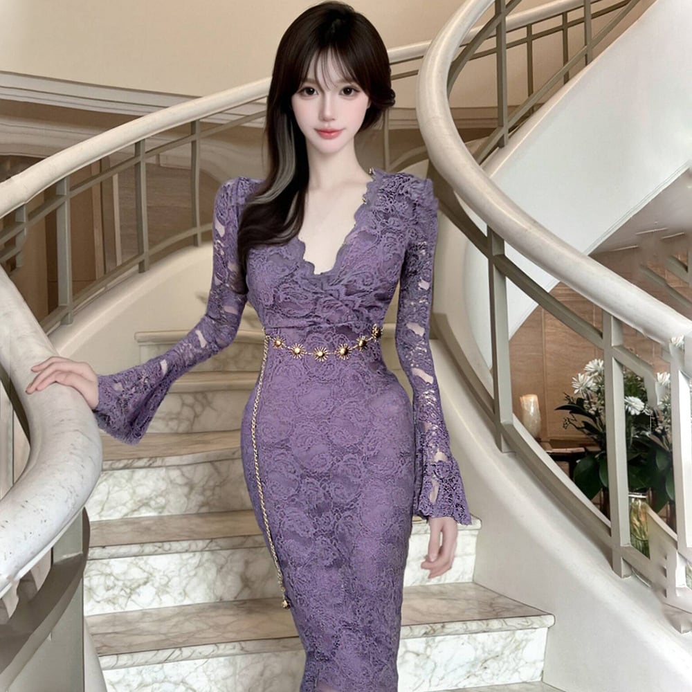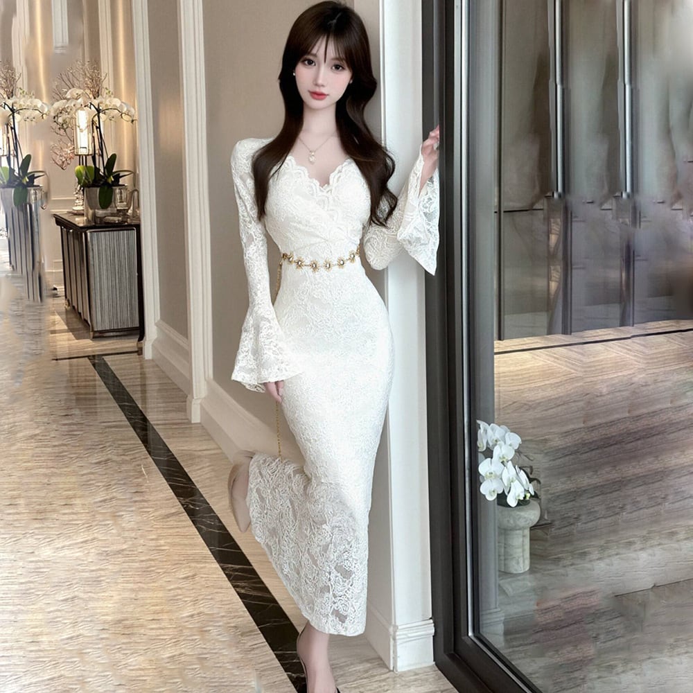 【3色】ロングドレス キャバドレス セクシー Vネック レース切り替え タイトワンピース ベルト付き 上品 シルエット LW2-DD6011