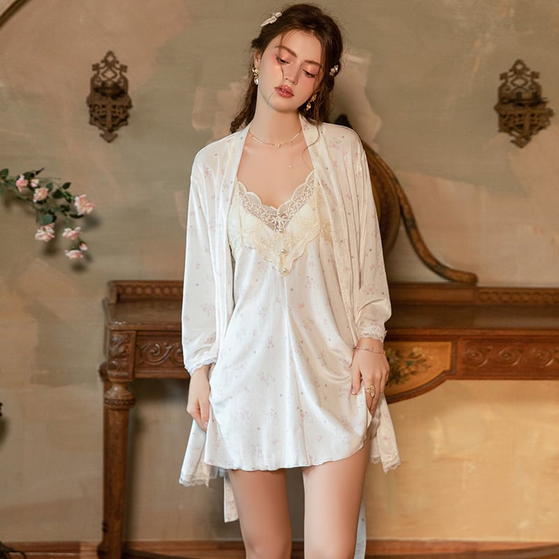Lady's coco ルームウェア ランジェリー セクシー ベロア素材 レース切り替え パッド入り キャミソール パール付き ローブセット LW2-GR6680
