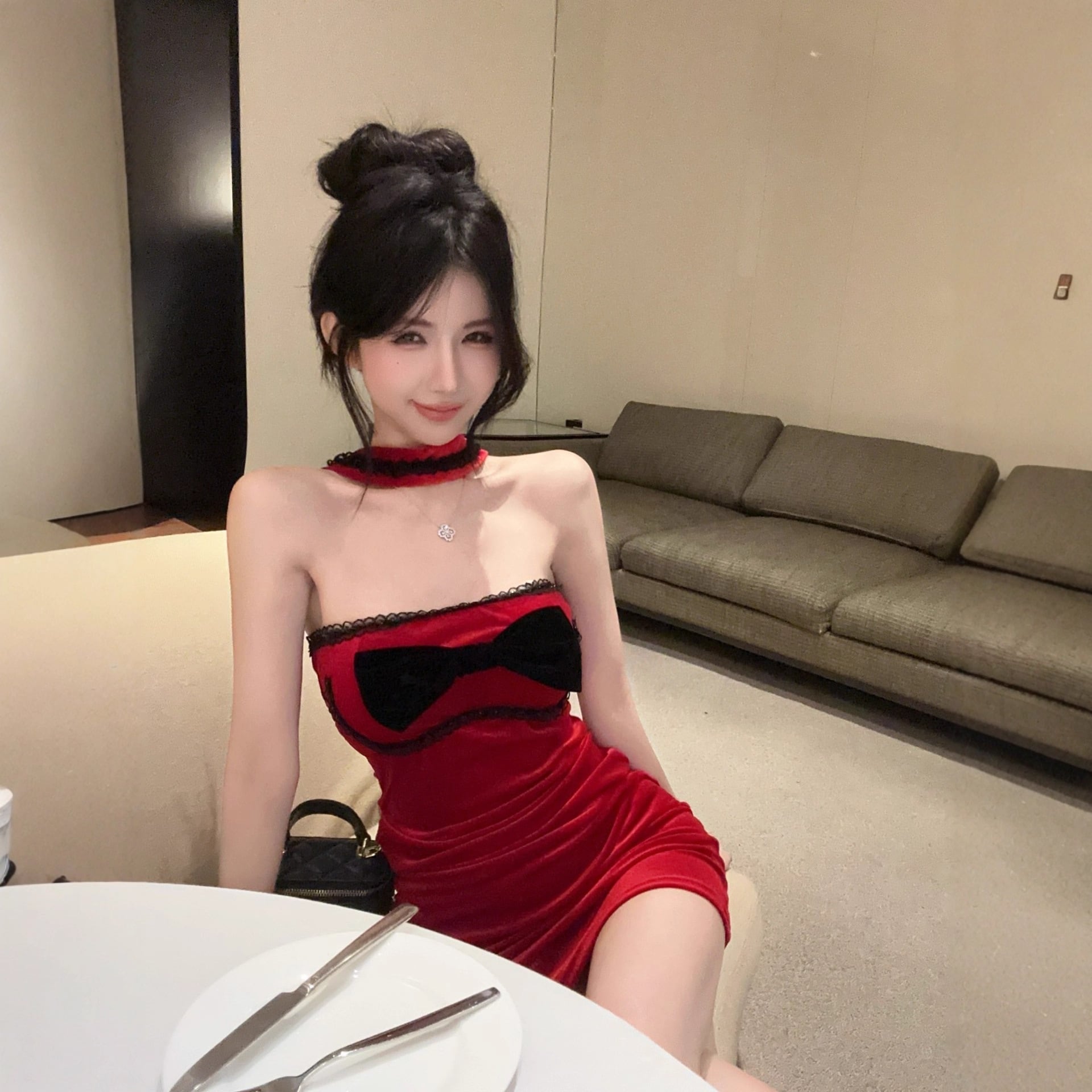 Lady's coco ミニドレス キャバドレス セクシー ベロア チューブトップ キャミワンピース ホルターネック リボン付き タイト LW2-OYF2661