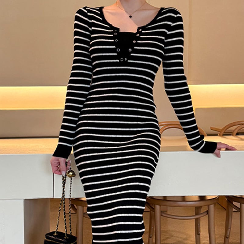 Lady's coco ロングドレス キャバドレス セクシー 秋冬新作 ニットワンピース クルーネック 長袖 ストライプ柄 タイトシルエット LW2-DD6032