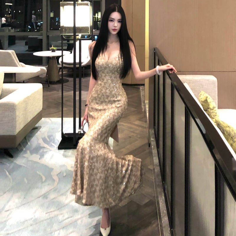 Lady's coco ロングドレス キャバドレス セクシー バックレス スパンコール マーメイドワンピ 交差ストラップ パーティー 二次会 JC2-XHY919310