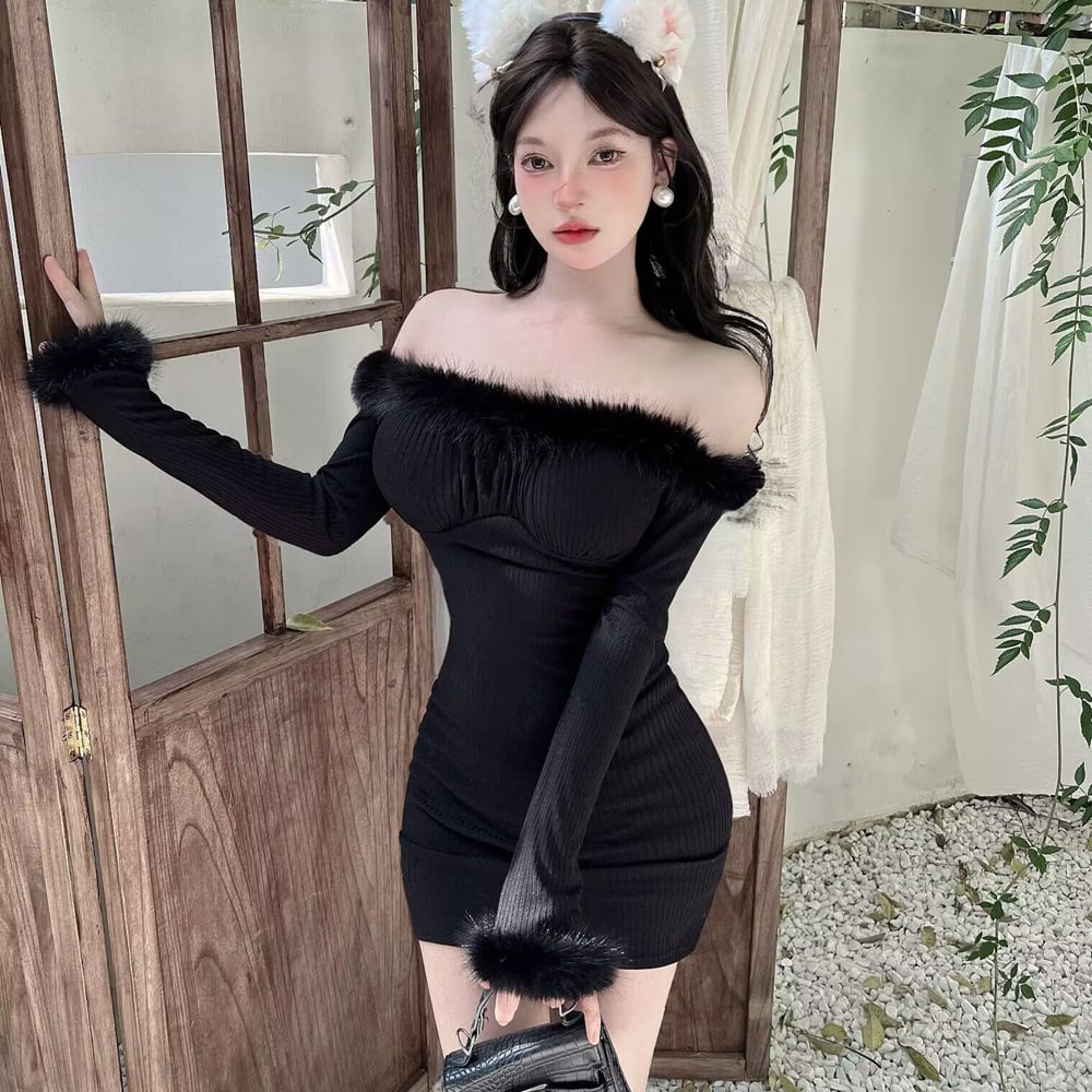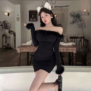 【3色】ミニドレス キャバドレス セクシー クリスマス フェザー オフショルダー ウエストマーク タイトシルエット 長袖 デート JC2-DD6108