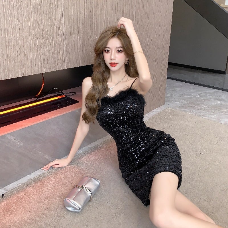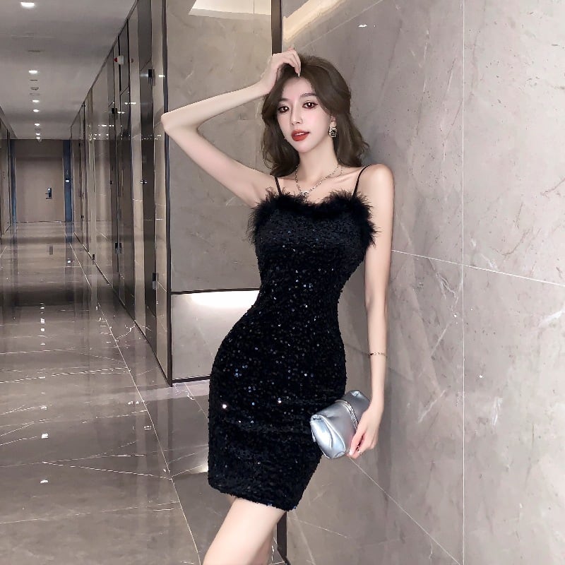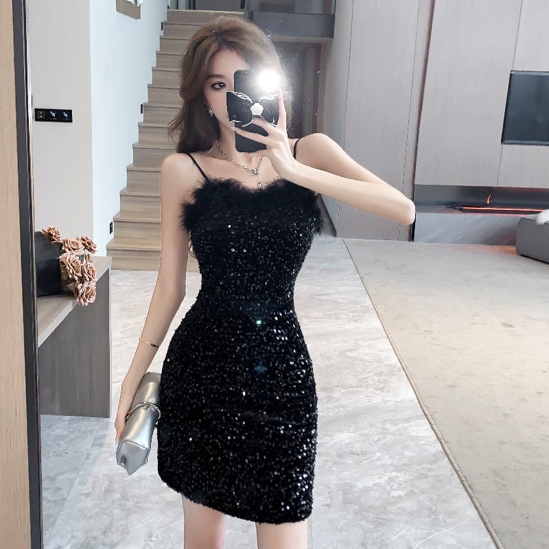 ミニドレス キャバドレス セクシー フェザー スパンコール キャミワンピ フレンチ風 ナイトアウト バー クラブ JC2-YKE6285