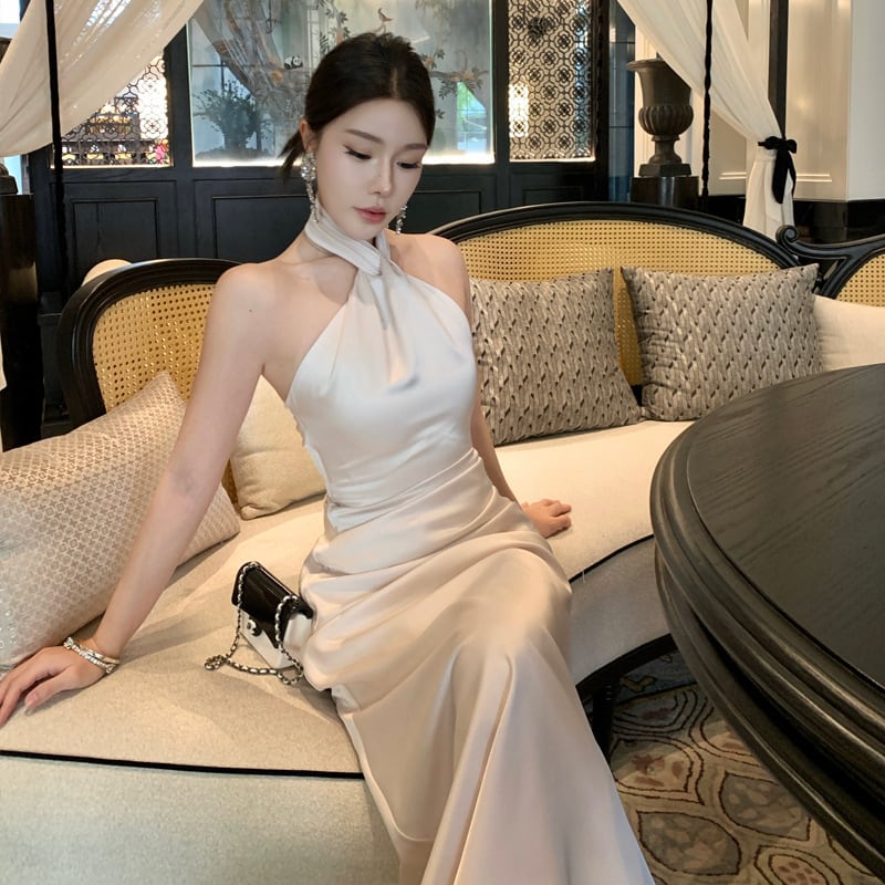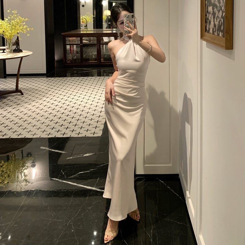 ロングドレス キャバドレス セクシー フレンチ 上品 サテン ハルターネック シンプル マーメイドライン JC2-XHY915231