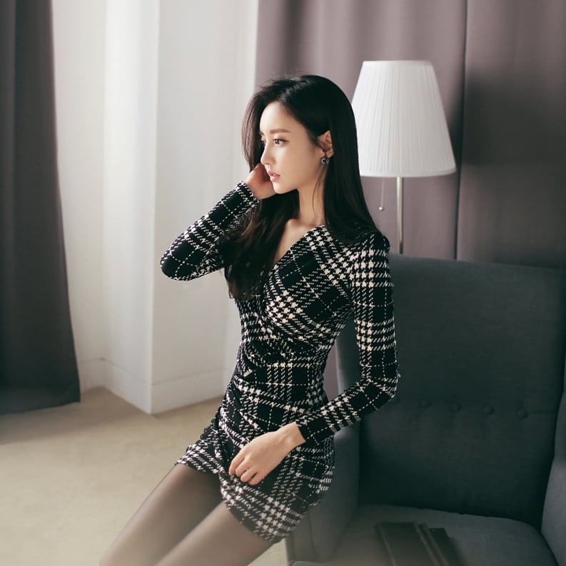 【2色】ミニドレス キャバドレス セクシー 韓国風 Vネック チェック柄 長袖 スリット入り タイトドレス 出勤 デート お出かけ JC2-MLS45164383
