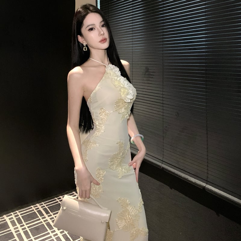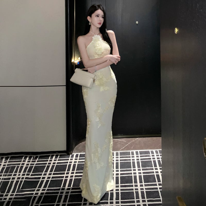 ロングドレス キャバドレス セクシー ホルターネック オープンバック 立体フラワー装飾 スタイルアップ タイト チュール マーメイドドレス エレガント 誕生日 パーティー JC2-XHY919316