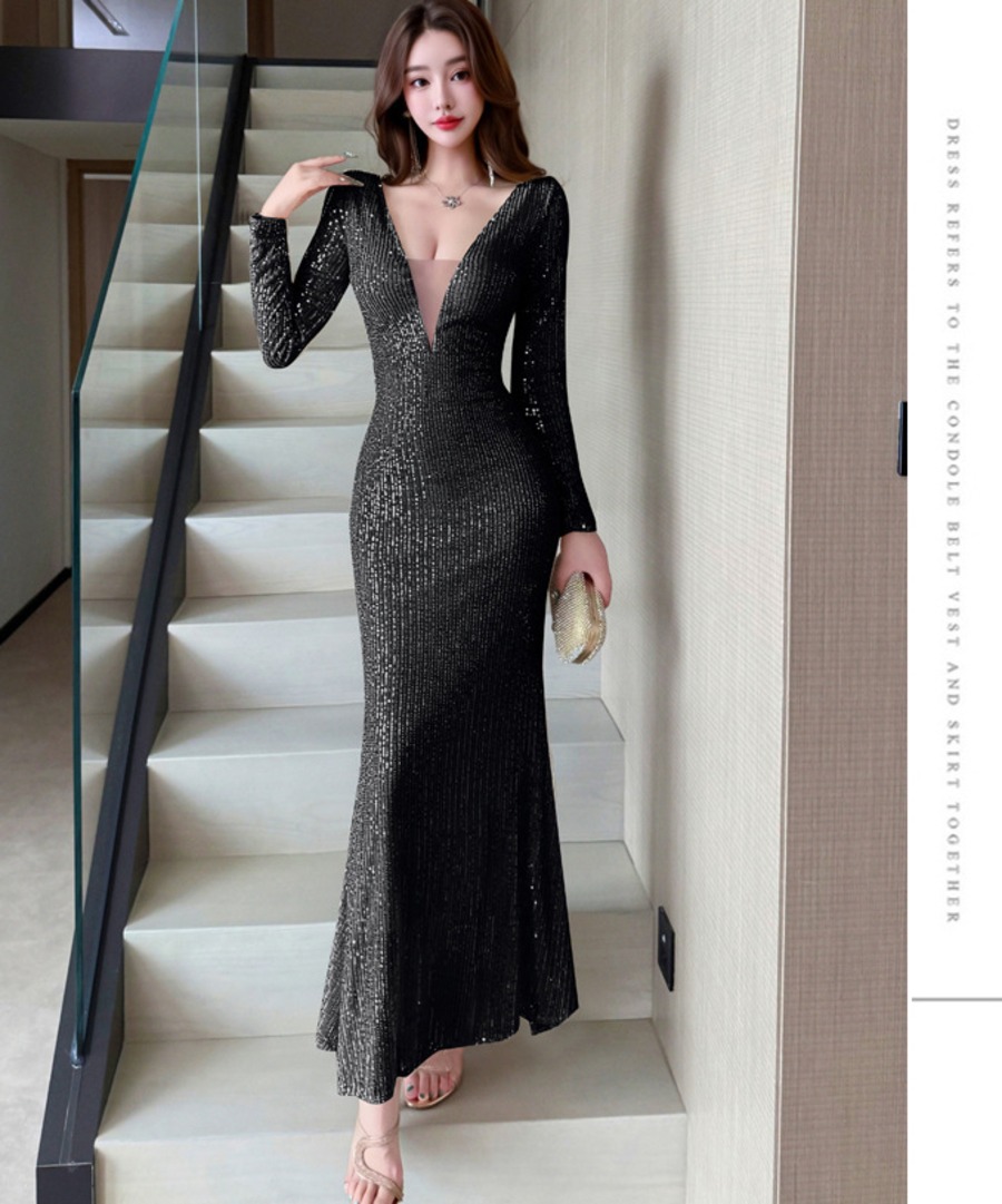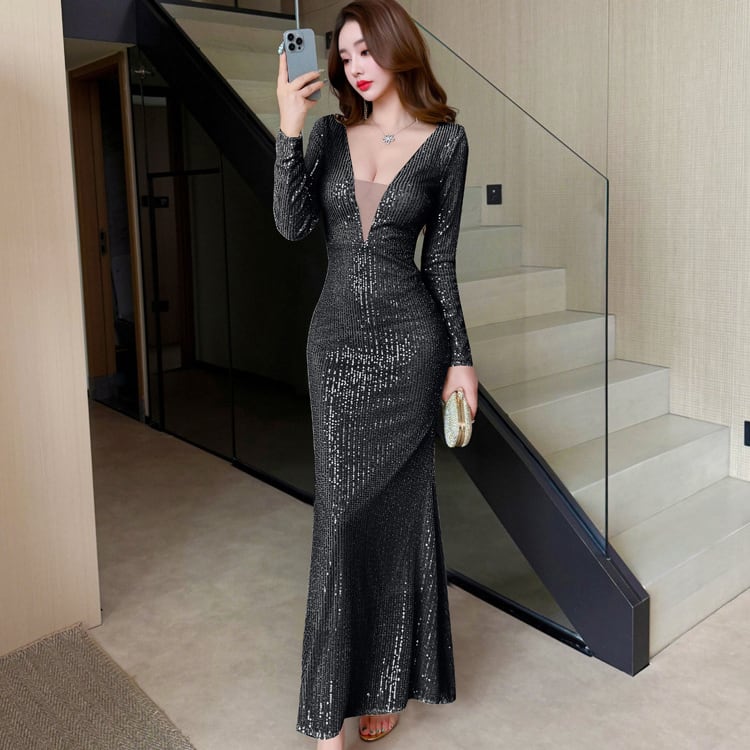 【3色】ロングドレス キャバドレス セクシー エレガント スパンコール ロングスリーブ おしゃれ パーティー JC2-ZED887237GT536