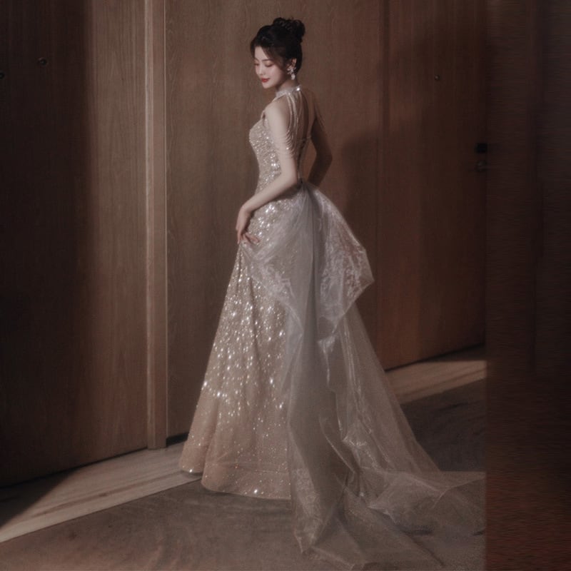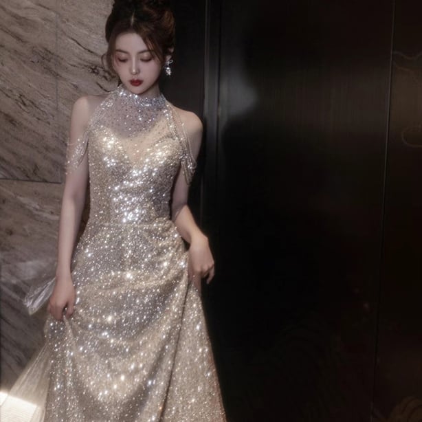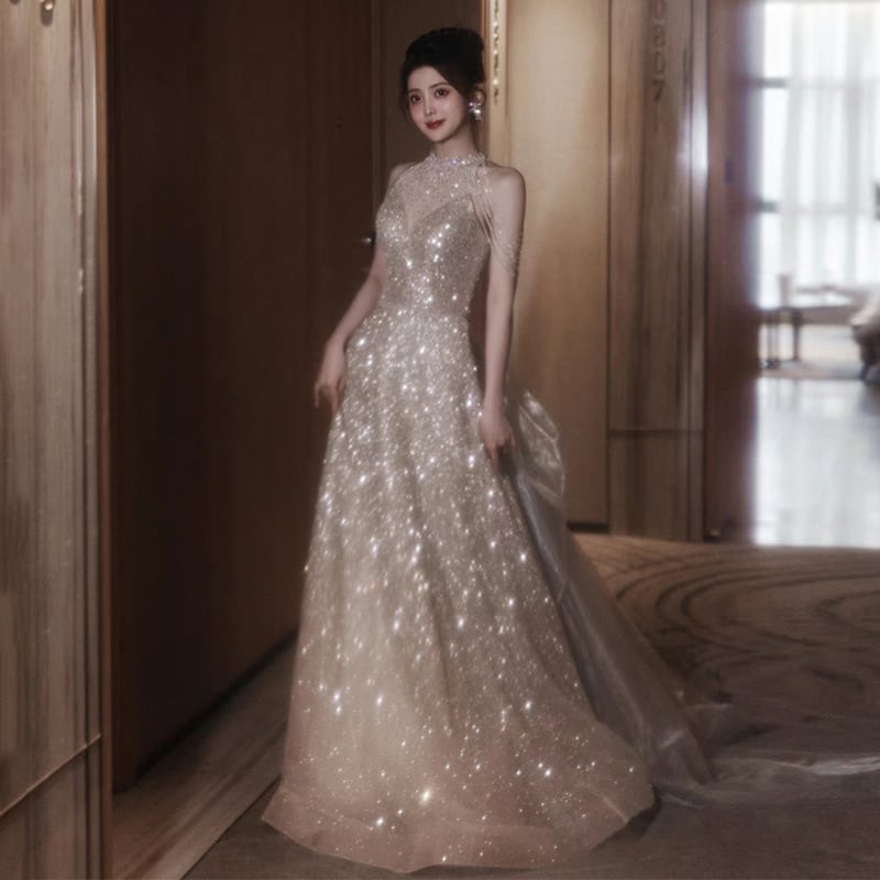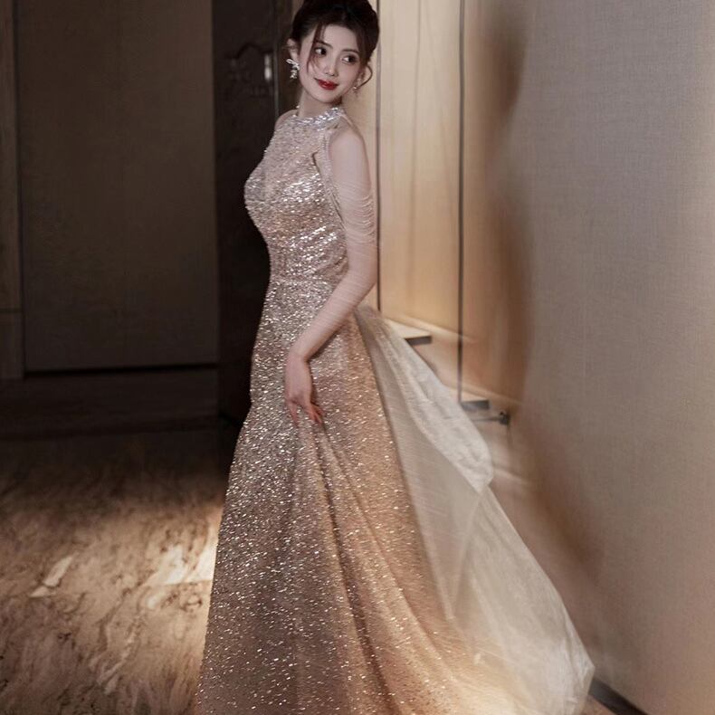 ロングドレス キャバドレス パーティードレス イブニングドレス ハルターネック シャンパンカラー エレガント きらきら ノースリーブ 誕生日 パーティー JC2-ZX323