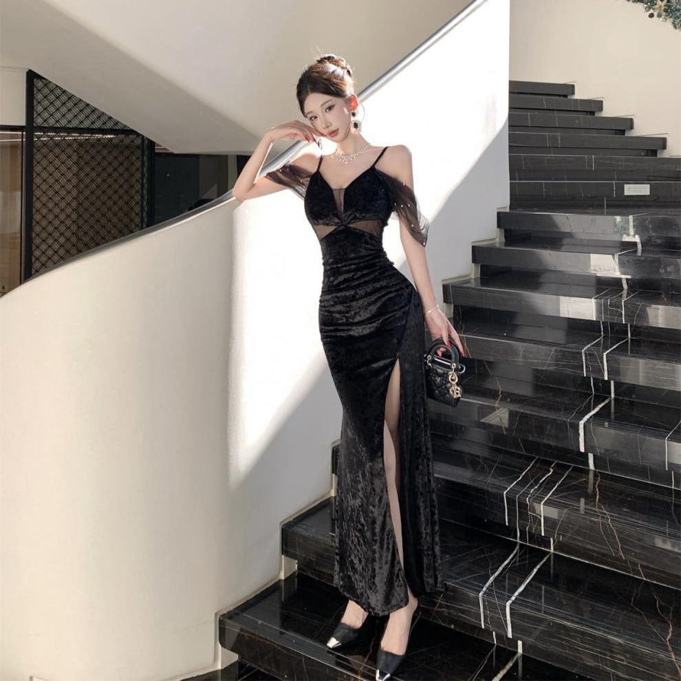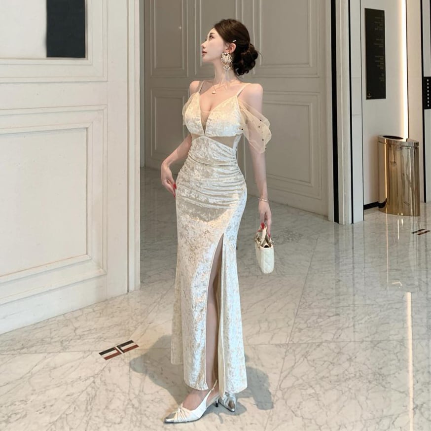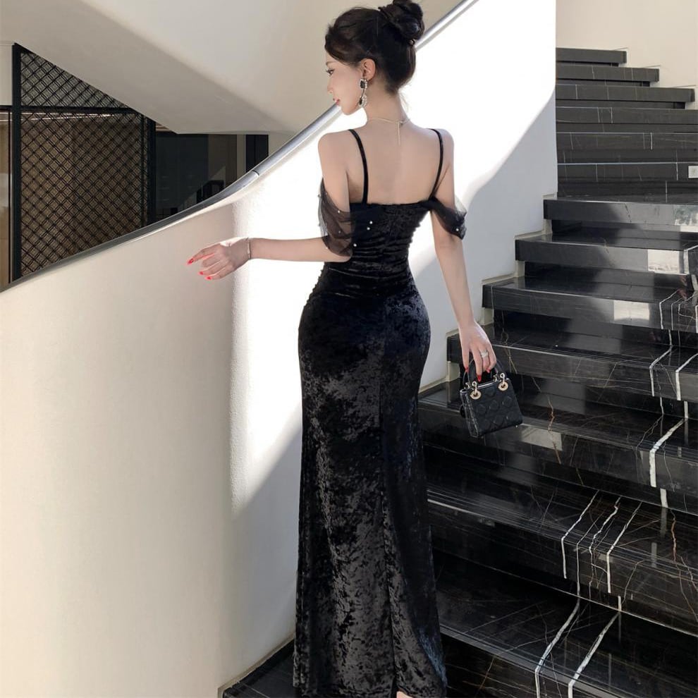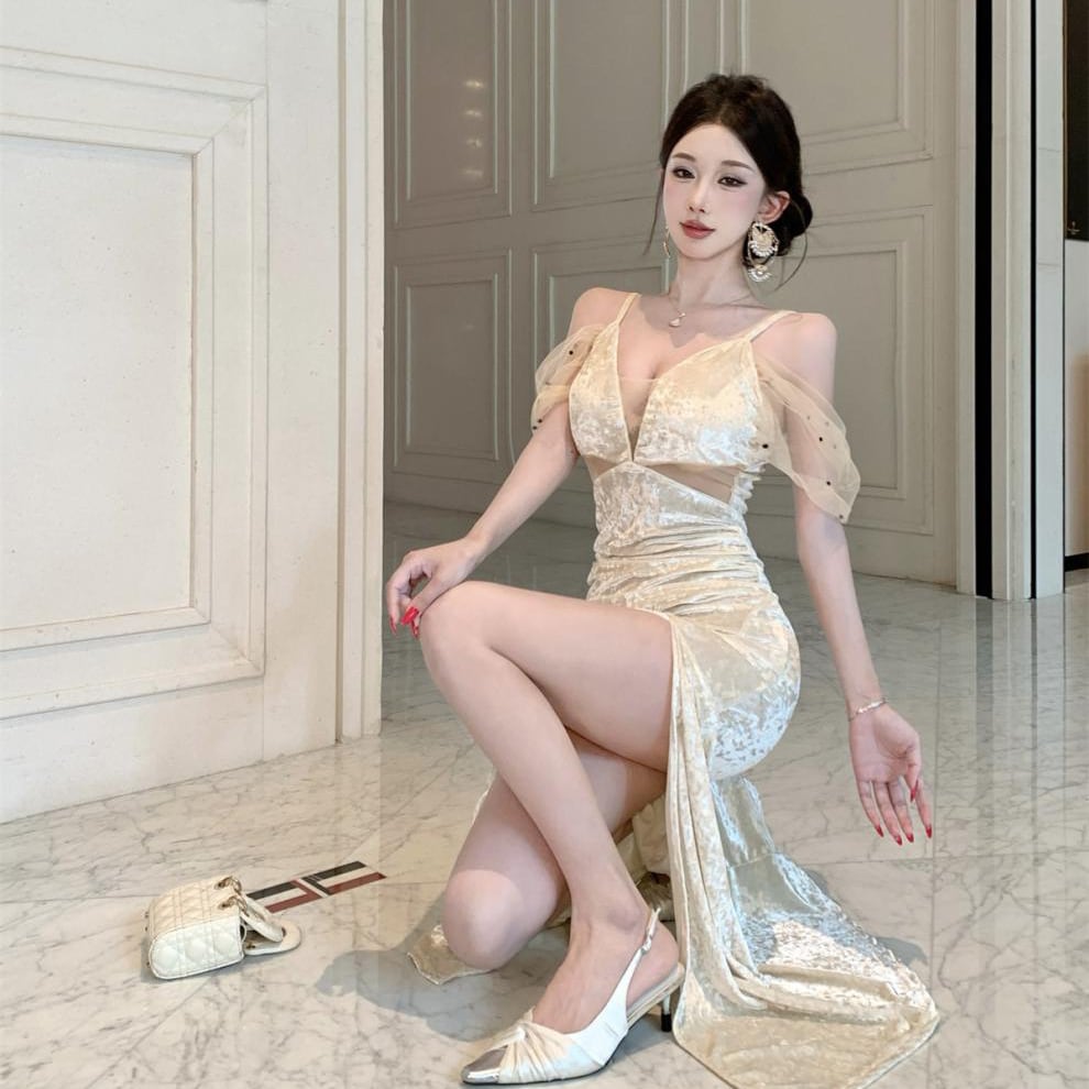 【2色】ロングドレス キャバドレス セクシー オフショルダー チュール ベロア 刺繍ビーズ スリット入り キャミワンピ パーティー JC2-ZED885708DXH238B