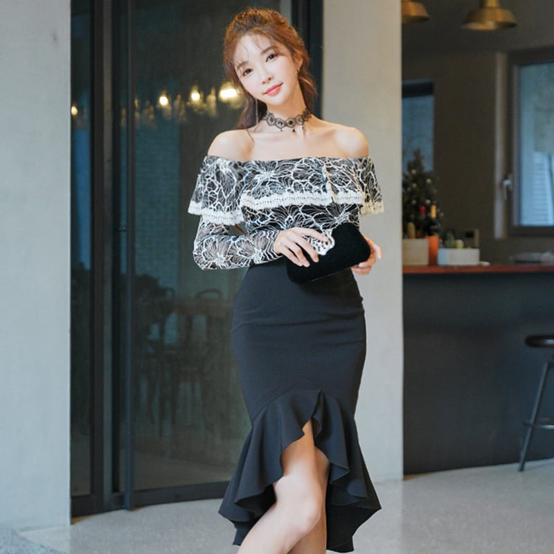 【上下セット】膝丈ドレス キャバドレス セクシー エレガント オフショルダー レース フリル タイト マーメイドワンピ 指名 デート JC2-ZED882020A71
