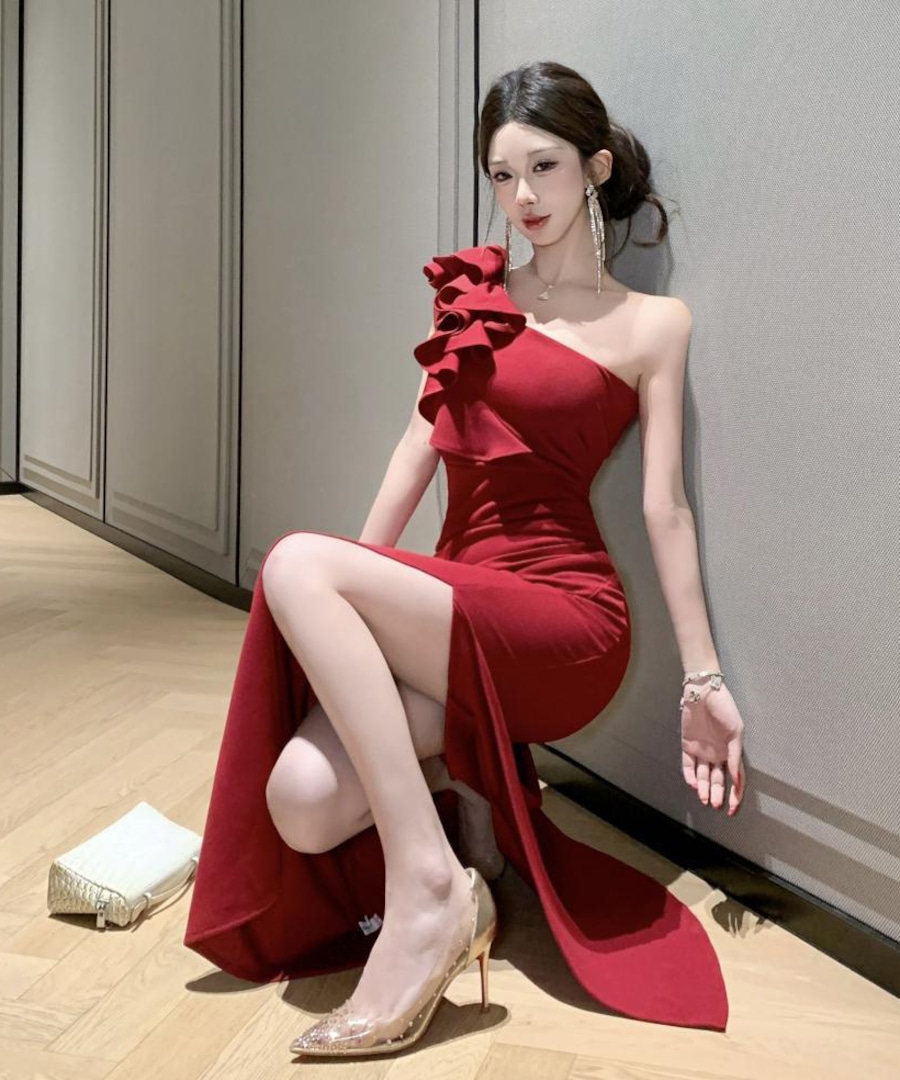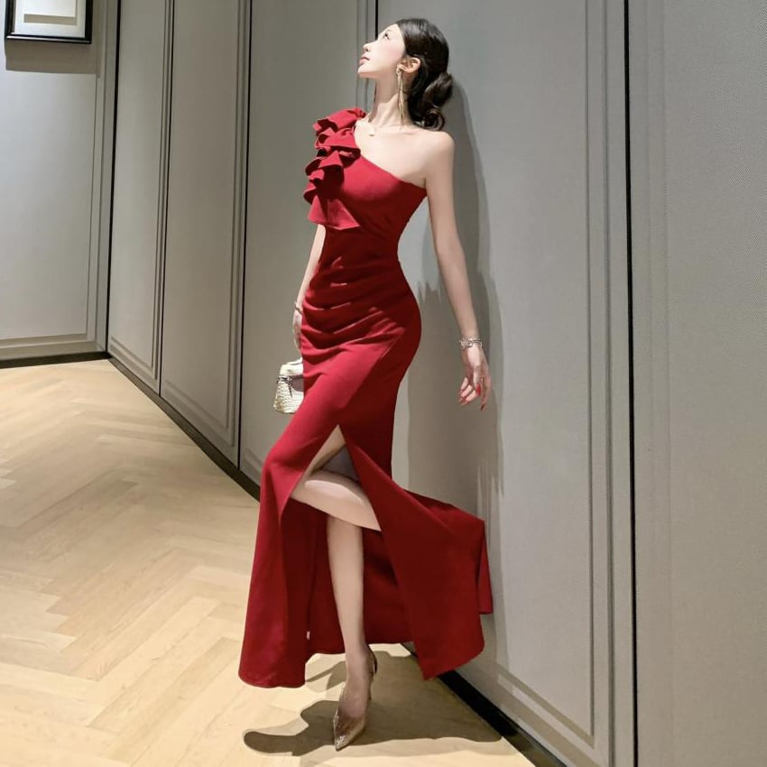 【2色】ロングドレス キャバドレス セクシー フリル ワンショルダー バックレス フレンチ風 ウエストマーク タイト スリット マーメイド パーティー JC2-YKE8742