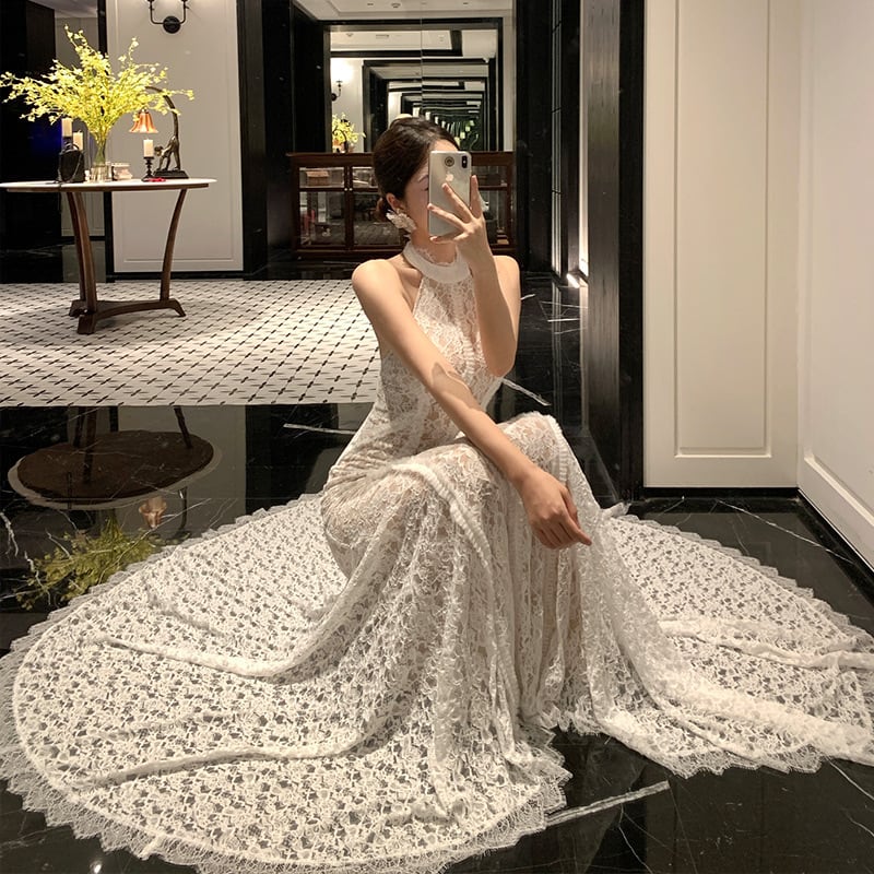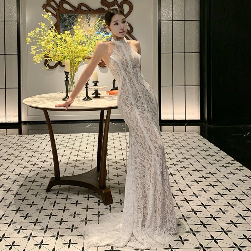 ロングドレス キャバドレス セクシー レース フリル ホルターネック バックオープン マーメイドライン パーティー JC2-XHY9895