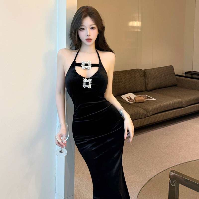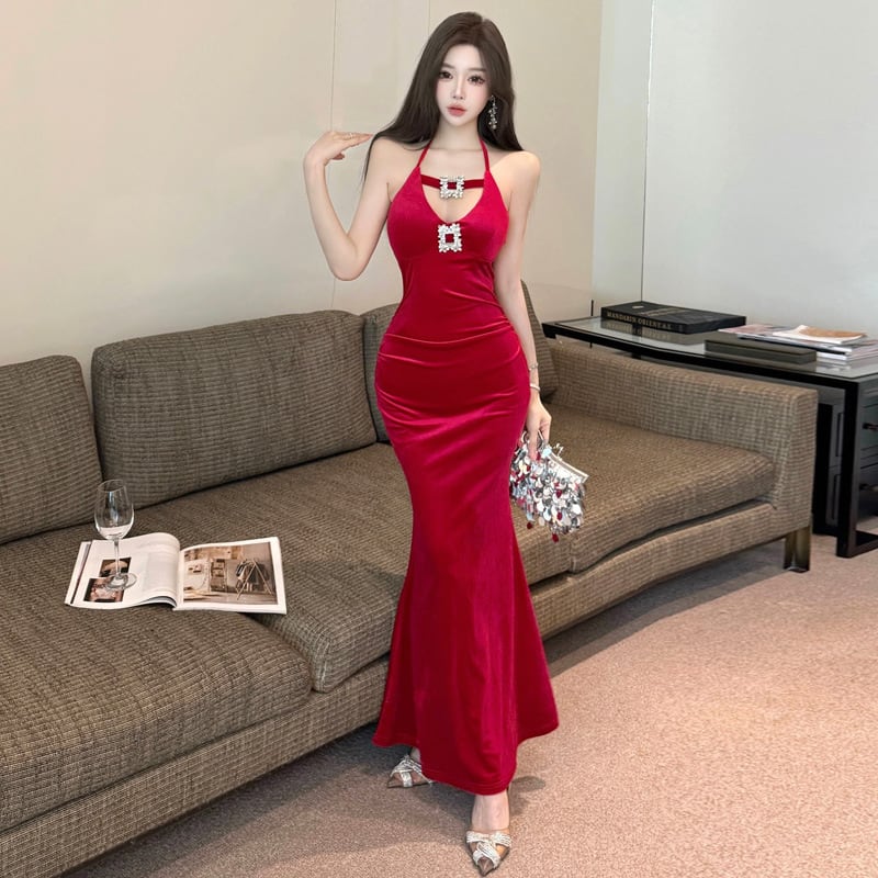 【2色】ロングドレス キャバドレス セクシー ホルターネック カットアウト ビジュー付き フィット感 JC2-WDS5508