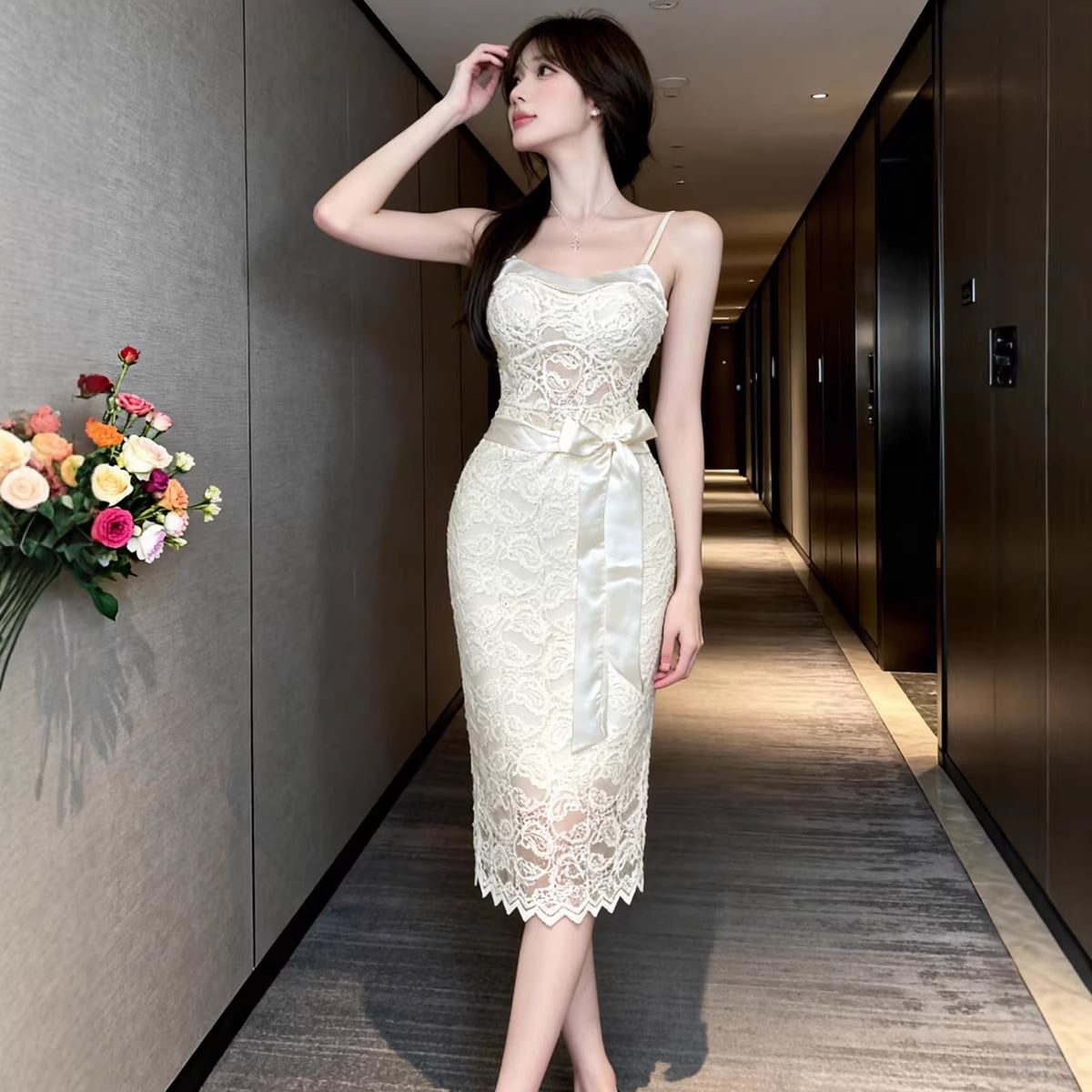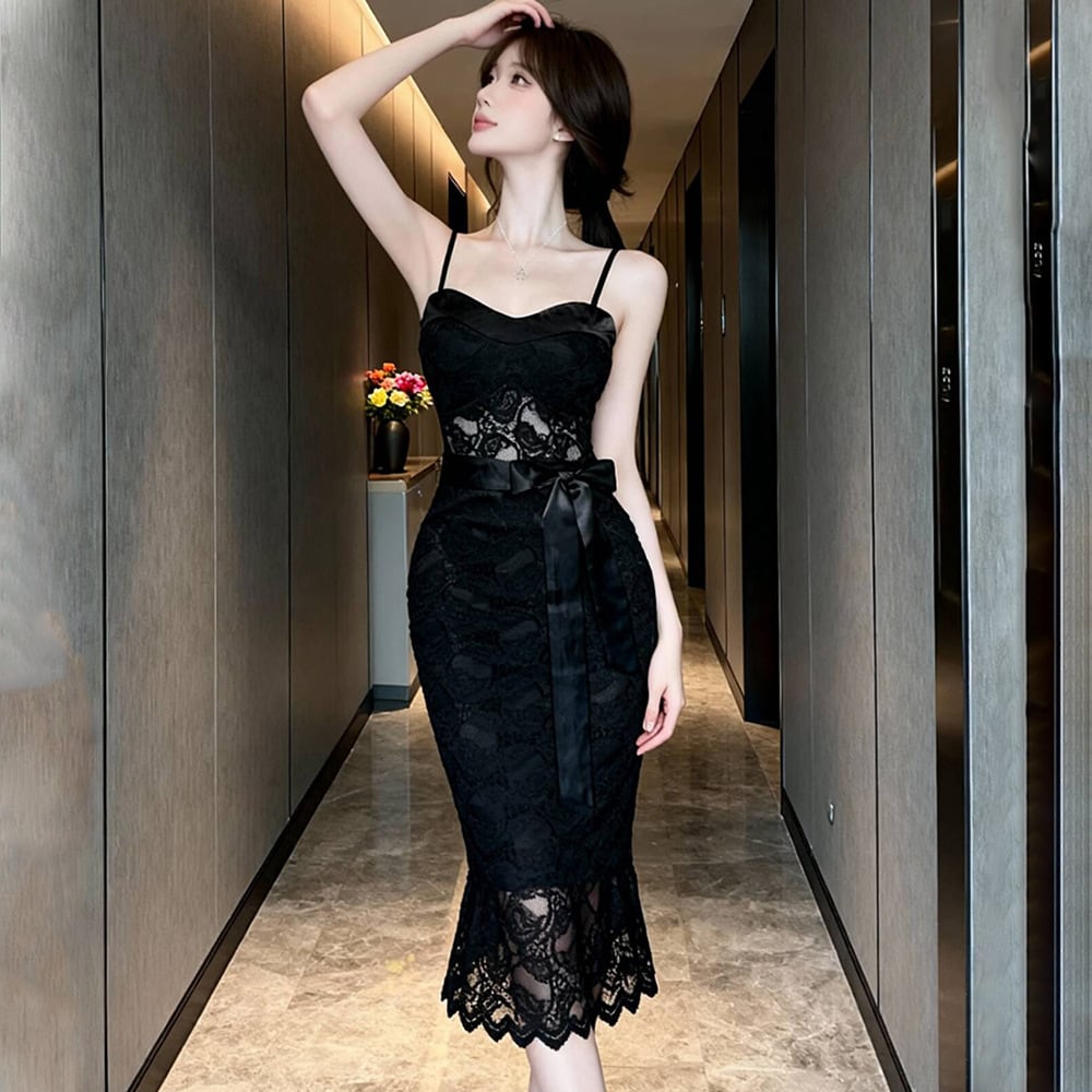 【2色】膝丈ドレス キャバドレス セクシー フレンチ レース キャミワンピ タイトフィット レースアップ JC2-DD6332