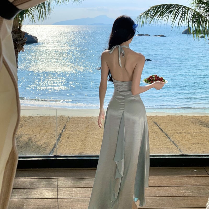 ロングドレス キャバドレス セクシー フレンチ 立体フラワー ホルターネック サテン ウエストマーク 上品 JC2-CD6-628-8100630