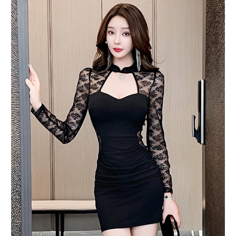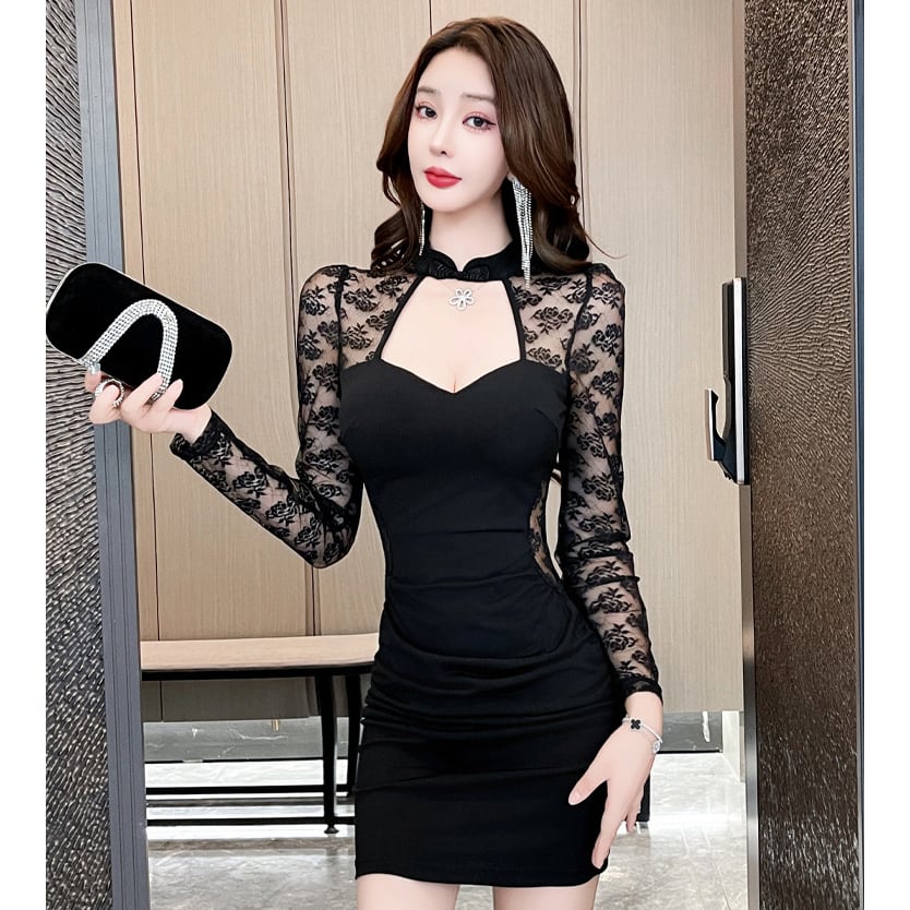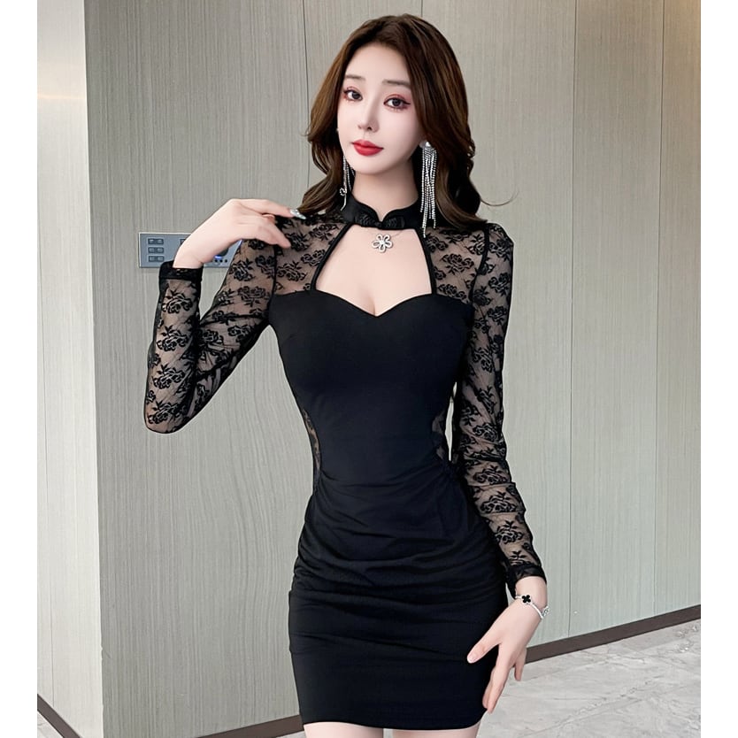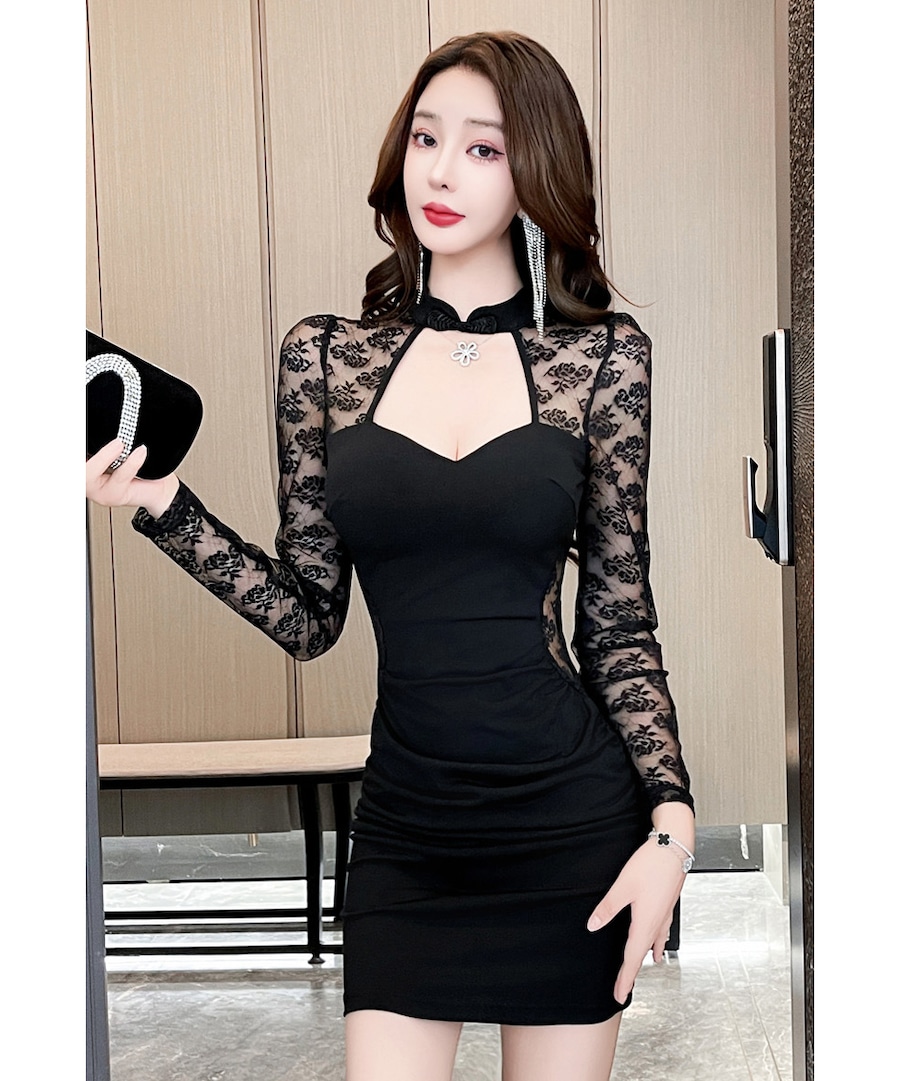 ミニドレス キャバドレス セクシー エレガント レース切替 ホルターネック ロングスリーブ タイト 指名 JC2-JX5685