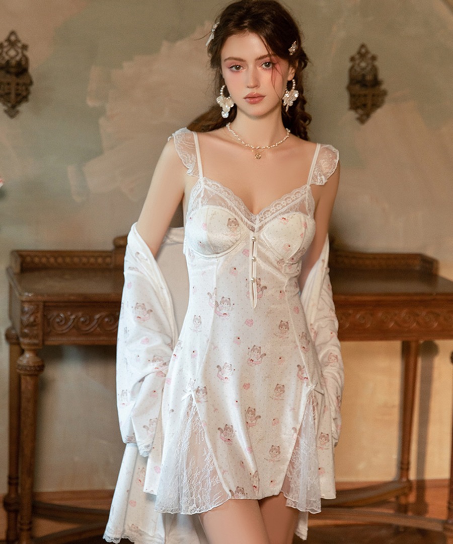 ルームウェア ランジェリー スイート系 フレアスリーブ 猫柄 ベルベット メッシュ切替 リボン JC8-GR6538