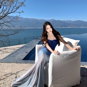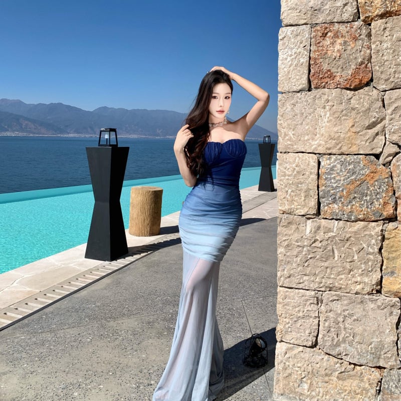ロングドレス キャバドレス セクシー フレンチ ブルーグラデーション ベアトップ タイトシルエット マーメイドライン JC2-XHY913269