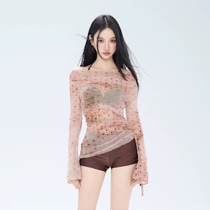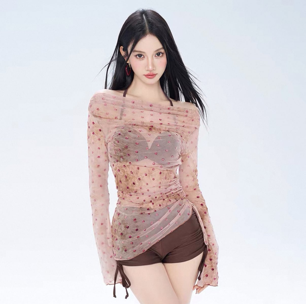 【3点セット】水着 ビキニ セクシー オフショルダー ドット柄 チュール 細見え ギャザー 長袖 ビーチ 温泉 JC7-KSD2639