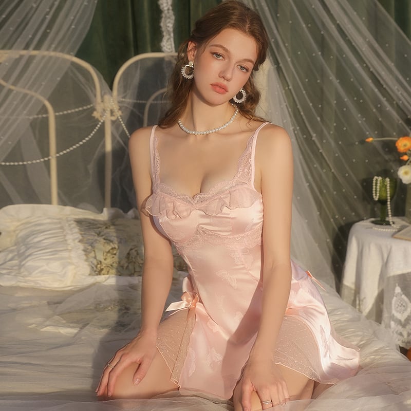 【2色】ルームウェア ランジェリー セクシー サテン ジャカード チュール シースルー Vネック バックオープン セット JC8-GR-WF6148