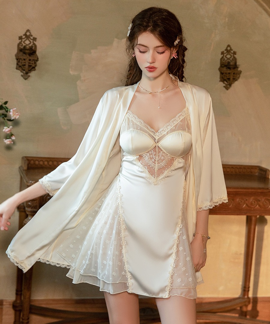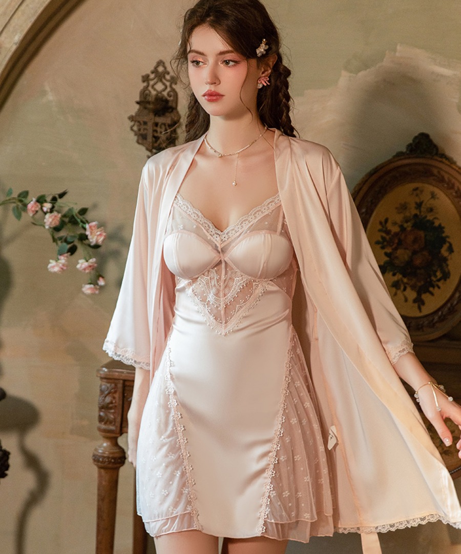 【2色】ルームウェア ランジェリー セクシー レース バックオープン サテン スウィート ガウン セット JC8-GR-M5924