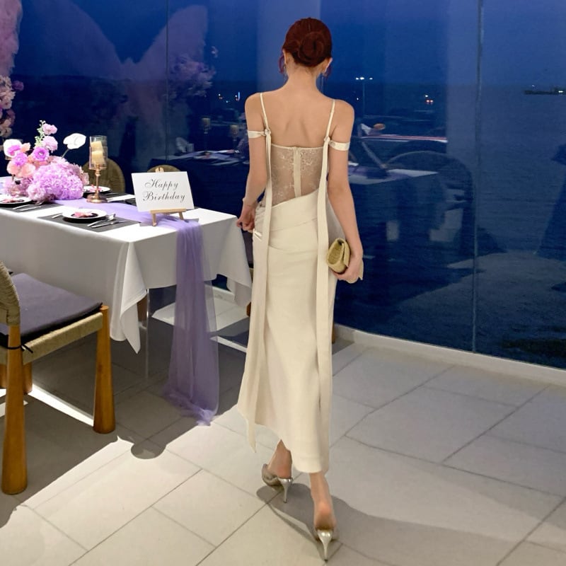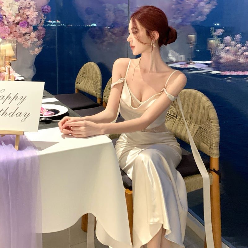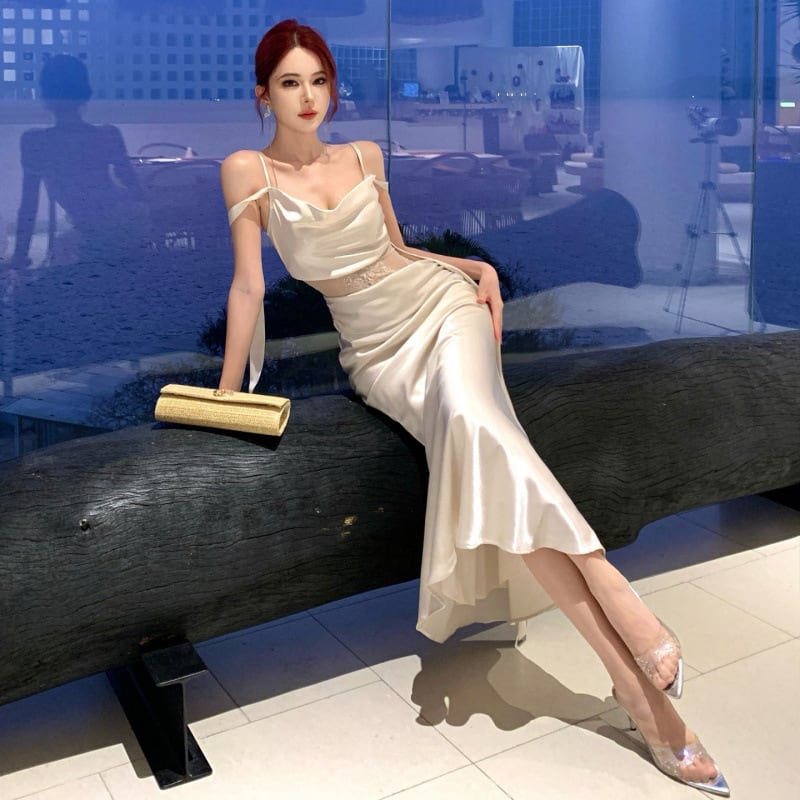 ロングドレス キャバドレス セクシー ドレープネック レース切り替え キャミワンピ ギャザー 着痩せ サテン バースデー パーティー JC2-XHY919336