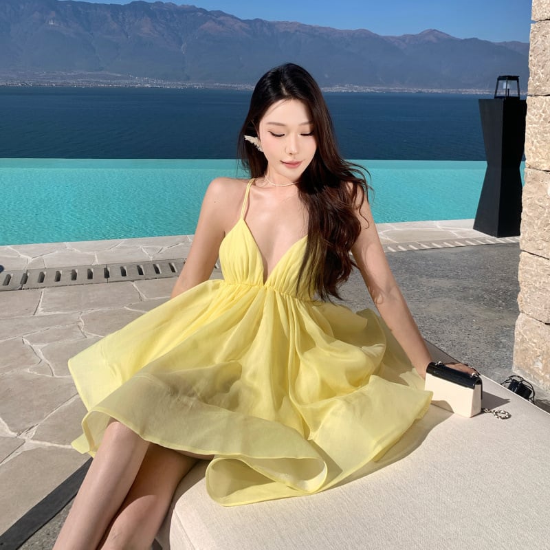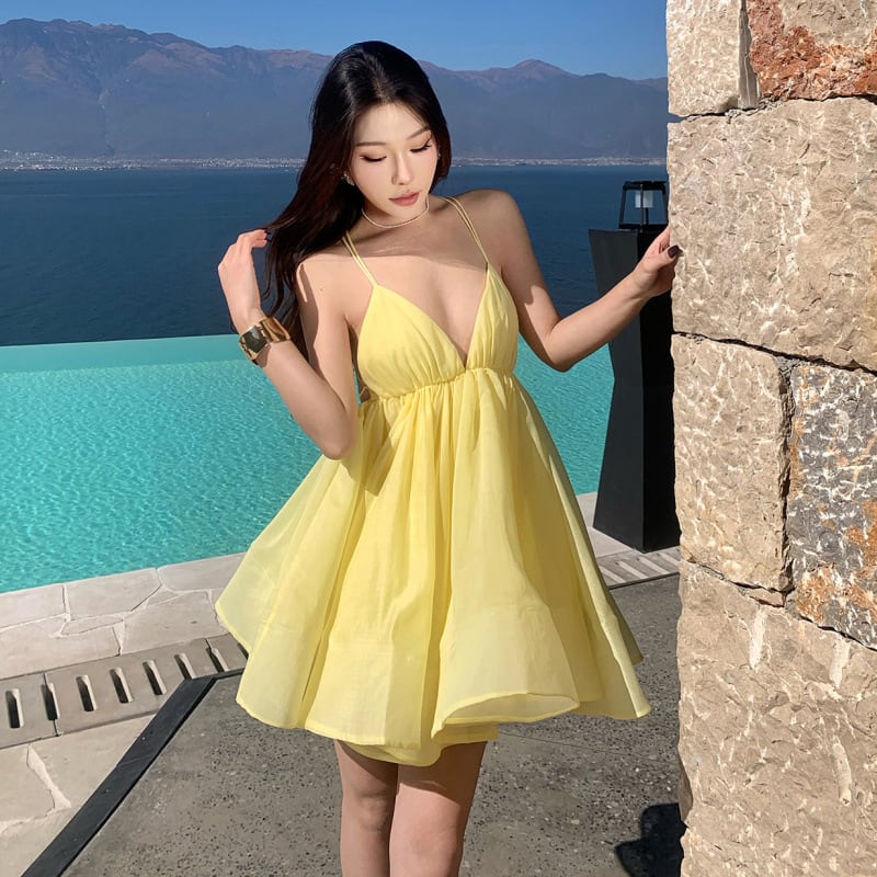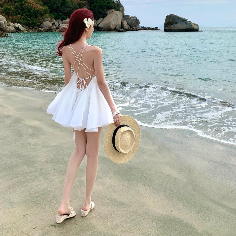 【2色】ミニドレス キャバドレス サンドレス キャミワンピ バックオープン レースアップ ボリュームスカート リゾートDQ2-XB1-165-10080600