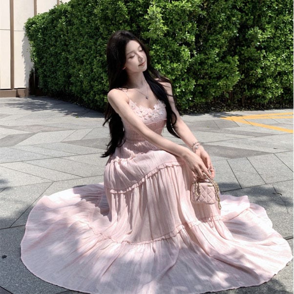ロングワンピース レディース キャミワンピース レース フリル ティアード ハイウエスト 体型カバー フェミニン 清楚感 夏 お出かけDQ2-XKD-D326-8025A-Apr1