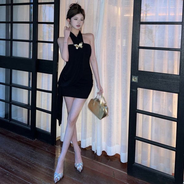 ミニドレス キャバドレス セクシー ホルターネック バタフライモチーフ ドレープ タイト ボディコン 高見え 指名DQ2-XKD-D310-3056-Apr1