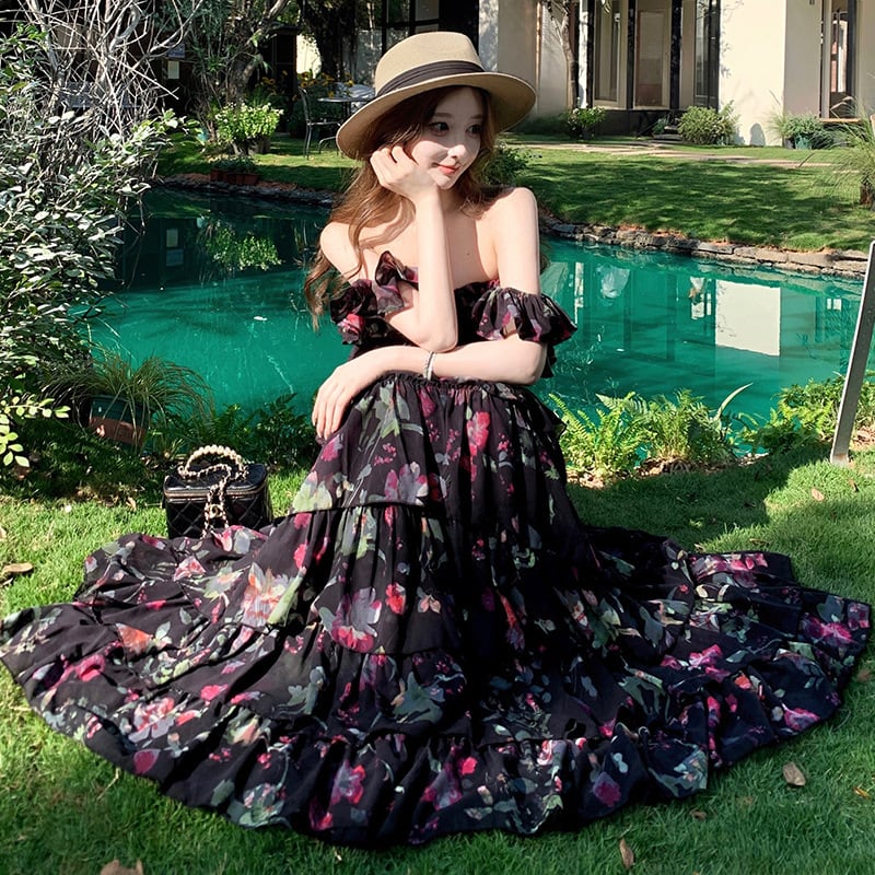 ロングドレス レディース オフショルダー フラワープリント ティアードスカート シフォン Aライン フレアシルエット リゾート風 フェミニンDQ2-XHY-913029
